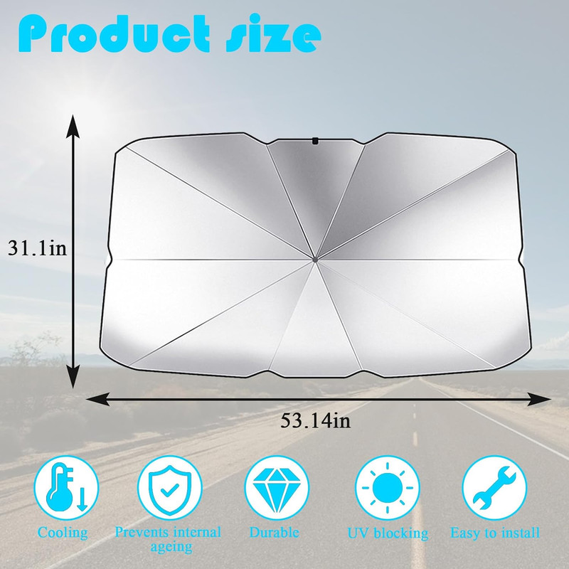 | سایر توضیحات | // جنس: PET + روکش نقره ای+ پلی استر // وزن تقریبی: حدود 400 گرم //نحوه باز شدن: بصورت چتری آسان و سریع // سبک و انعطاف پذیر // محافظت در برابر اشعه ماوراء بنفش //کاهش دمای داخلی خودرو |