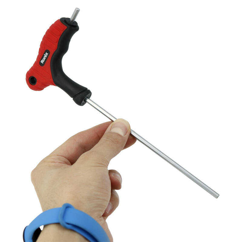 سایر توضیحات آچار آلن دسته تی 6 گوش رونیکس مدل RH-2007 سایز 4 میلی متر متریال ساخت از جنس فولاد کروم وانادیوم با روکش سطحی مات الکتروپلیت جهت جلوگیری از زنگ زدگی دسته T شکل با طراحی ارگونومیک و روکش TPR، مجهز به حفره روی دسته جهت آویز