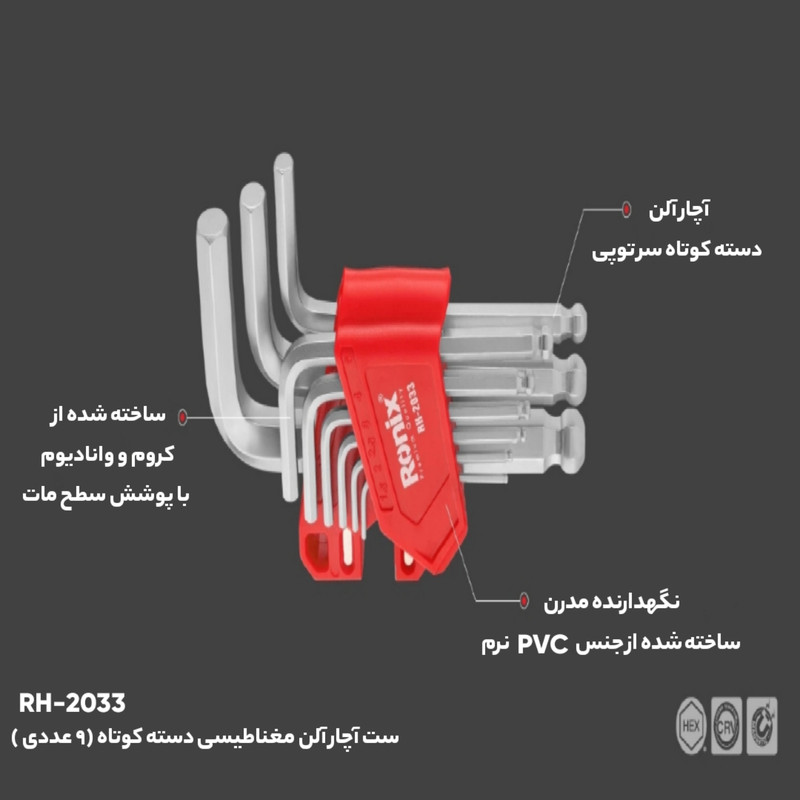 آلن شش گوش Ronix مدل RH-2033 از کروم وانادیوم (CRV) ساخته شده و دارای سطحی مات است که از زنگزدگی جلوگیری کرده و باعث افزایش دوام ابزار میشود. نگهدارنده این ابزار دارای طراحی مدرن و منحصربهفرد بوده و از جنس PVC نرم و با قابلیت ایجاد خاصیت آهنربایی است. این ابزار توانایی تحمل گشتاور بالایی است. سری آهنربایی این آلن به سرعت قابلیت مغناطیسی شدن را دارد. همچنین دارای دستهای استاندارد و با سری گرد شده است که کار با آن را بسیار آسان میکند.