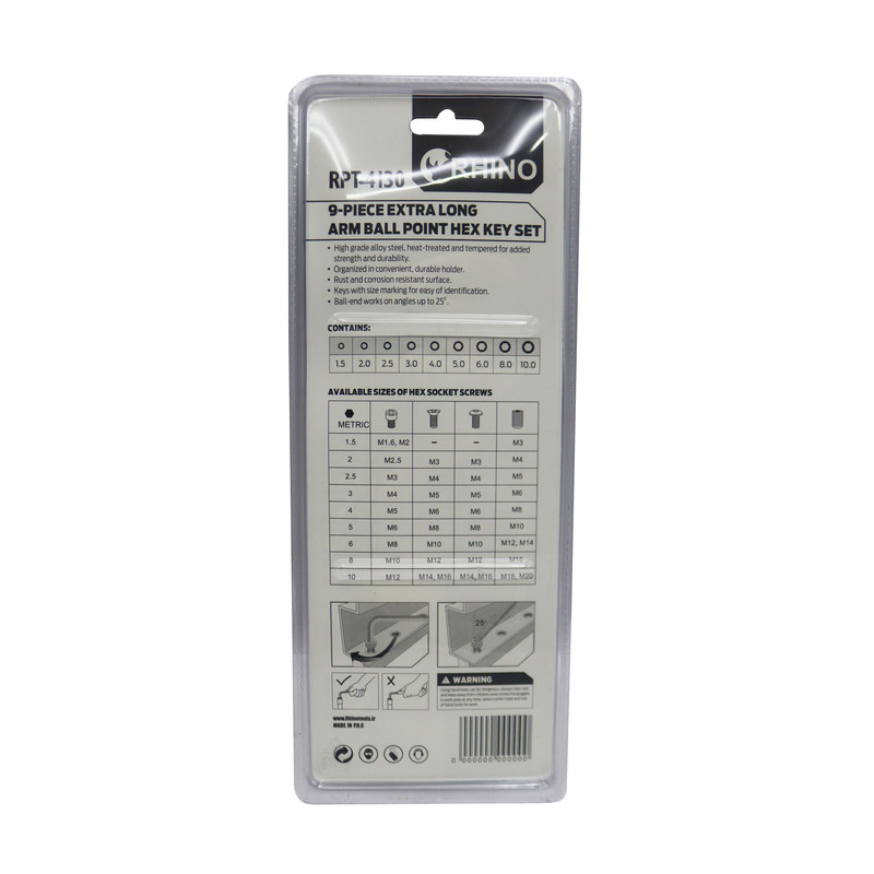 سایر توضیحات | - آچار آلن شش گوش ( شش پر ) رینو - مجموعه 9 عددی - دارای 9 عدد آچار آلن بلند در سایز های : 1.5 - 2 - 2.5 - 3 - 4 - 5 - 6 - 8 - 10 میلی متر - جنس : کروم وانادیوم با مقاومت بالا |