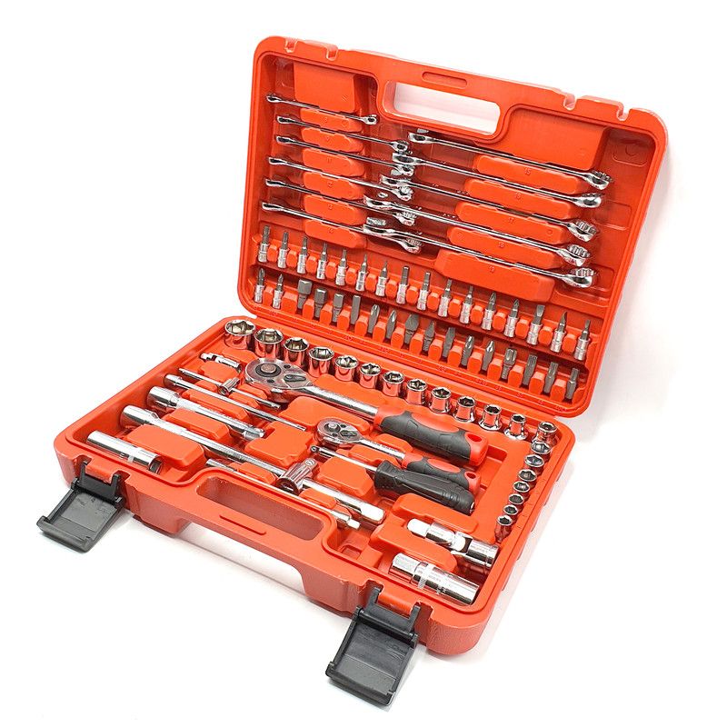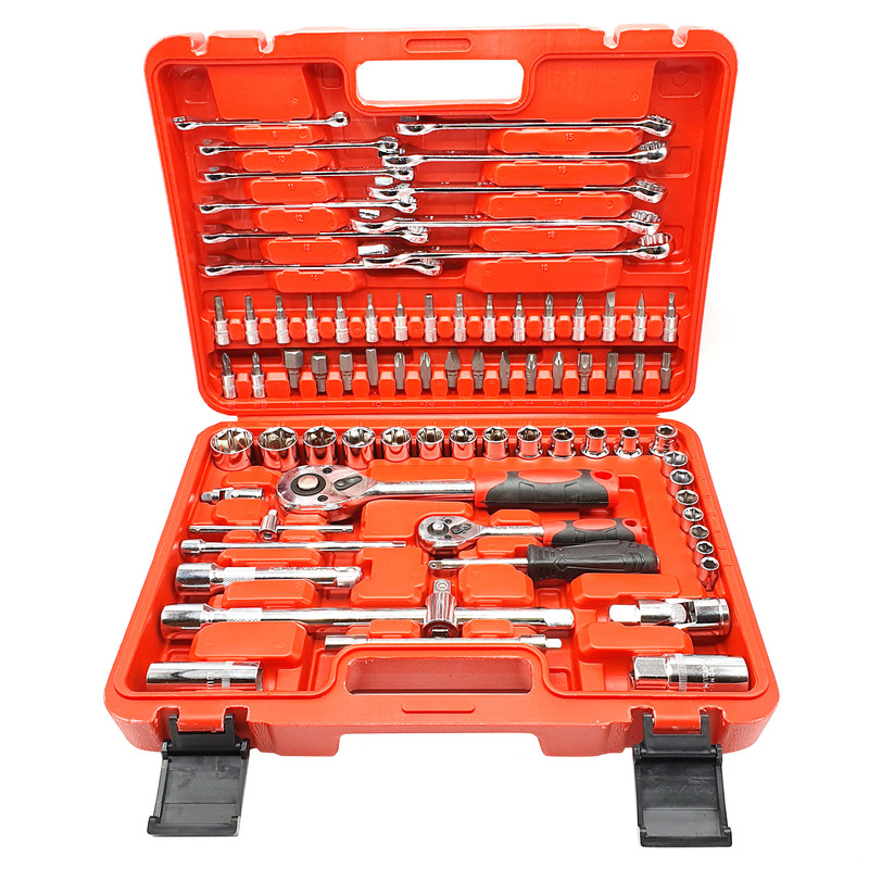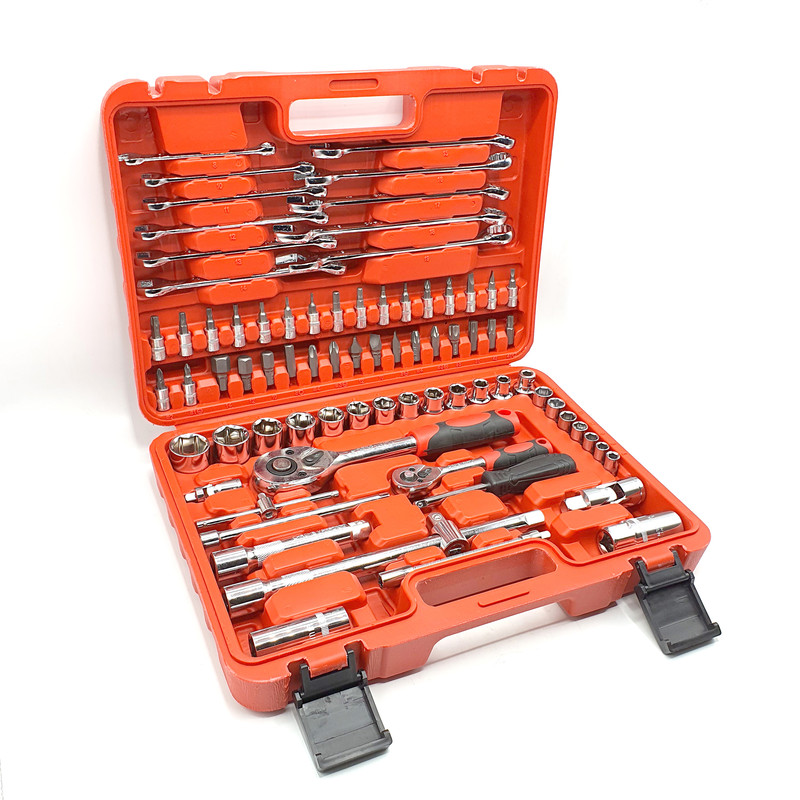 اقلام همراهدارای 78 عدد انواع بکس شامل 11 عدد آچار از سایز 8، 10، 11، 12، 13، 14، 15، 16، 17، 18، 19 میلیمتر می باشد x 12 عدد بکس درایو 1/2 اینچ شامل سایزهای 8، 10، 12، 13، 14، 15، 16، 17، 18، 19، 20، 22، 24 می باشد x 7 عدد بکس درایو 1/4 اینچ شامل سایزهای 7، 8، 9، 10، 11، 12، 13 میلیمتر می باشد. xدارای انواع کمکی لقلقی کشویی و ... در سایزها مختلف است. xدارای 33 عدد انواع نوک پیچگوشتی و بکس نوک پیچگوشتی دار می باشد
