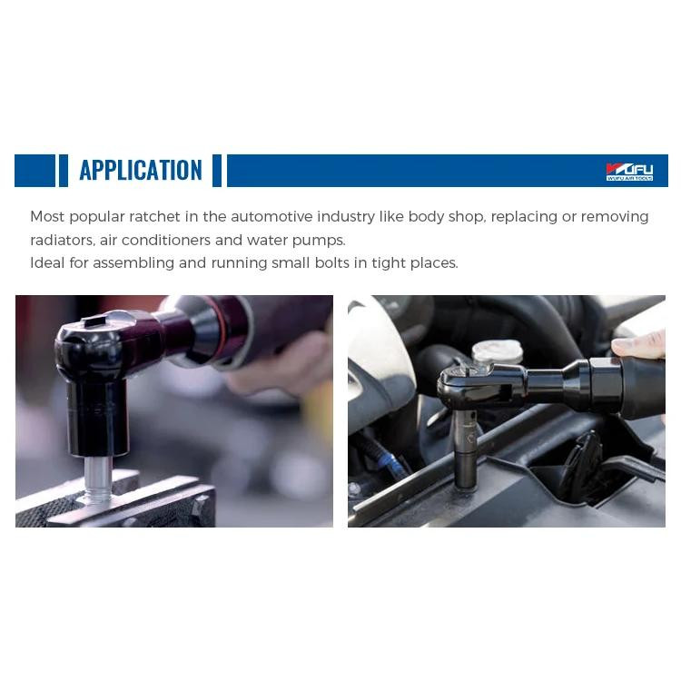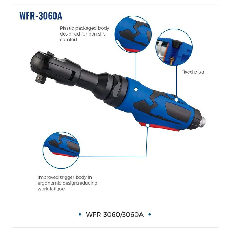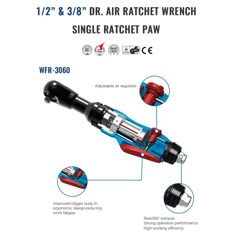 سایر توضیحات | یک آچار جغجغه بادی پرکاربرد برای باز کردن و بستن انواع پیچ و مهره ها مجهز به کلید تعیین جهت چرخش موافق و معکوس (راست گرد و چپ گرد) بدنه ساخته شده از کامپوزیت جهت افزایش دوام و کاهش وزن جغجغه بادی طول مناسب برای دسترسی به نقاط تنگ و دشوار مانند داخل موتور خودرو اگزوز خروجی 360 درجه در عقب دسته جهت جلوگیری از پاشش باد به سمت سطح کار ورودی باد قابل تنظیم بر اساس نیاز اپراتور و شرایط محیط کار طراحی ارگونومی بدنه جهت گرفتن راحت در دست و آسودگی کاربر هنگام استفاده کیفیت ساخت مطلوب و دارای عمر و دوام مناسب در محیط های صنعتی |