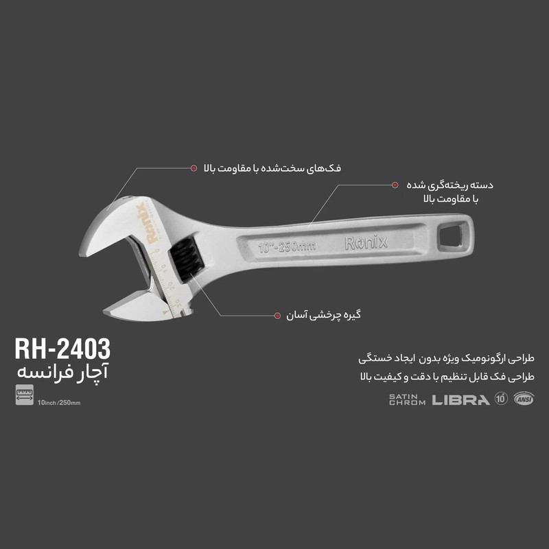 | سایر توضیحات | - تولید شده از فلز با کیفیت با تضمین قدرت و دوام بالا - طراحی پیشرفته برای انجام کارهای متنوع در عین راحتی - فکهای قوی با دوام بسیار بالا جهت ایجاد کارایی بهینه و فشار مناسب روی قطعه کار - طراحی ارگونومیک جهت جلوگیری از خستگی دست کاربر و تسلط بالای آن - دارای دستهای با مقاومت بالا جهت استفاده های طولانی مدت - تنظیم دقیق فکها برای دربرگرفتن پیچها، مهرهها و وسایل گوناگون با اندازههای متفاوت - پیچ تنظیم فک متحرک با بالاترین دقت و کیفیت - قابلیت درجه بندی بر اساس سانتیمتر و اینچ در هر دو طرف - تولید شده طبق استاندارد ANSI |