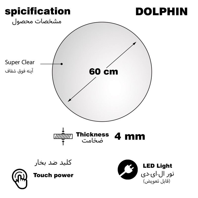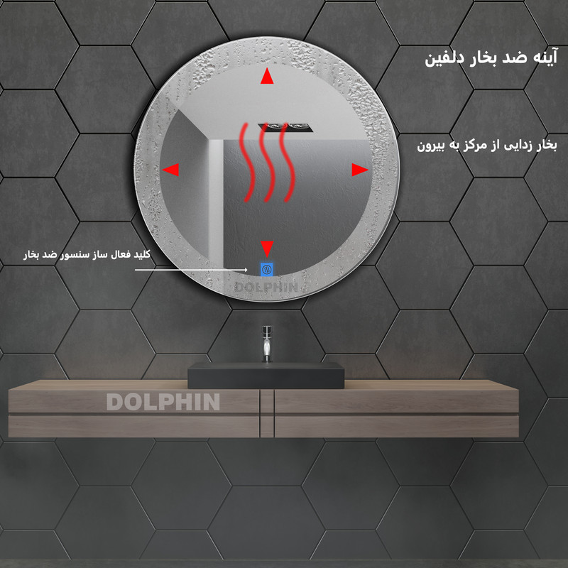 آینه نوری و ضد بخار دلفین مدل TCH-HT-Q 70 . یکی از مشکلات آینه ها در فضای رطوبتی مثل حمام بخار گرفتگی آن است که مانع استفاده از آینه میشود.آینه ضد بخار دلفین دارای پد حرارتی در پشت اینه است که پس از فعال کردن دکمه لمسی آن بخار سطح اینه را از بین میبرد.این پد حرارتی توسط اداپتور متصل به آن قابلیت اتصال به برق شهری را دارد .همچنین نوار نورانی دور آینه نقش یک چراغ با نوری مناسب را برای حمام و دستشویی شما بازی میکند. کلید لمسی ضد بخار و نور اینه از هم تفکیک شده اند و نیازی به فعال بودن هر دو با هم نیست.توجه داشته باشید که مانند تمام وسایل برقی آب را مستقیم به روی قظعات برقی نریزید. آینه به کار رفته از نوع سوپرکلیر با پوشش 2 لایه است که مقاومت آینه را در برابر عوامل محیطی مثل رطوبت بالا میبرد. تکنولوژی فلوت (FLOAT) به کار رفته در تولید آینه باعث از بین رفتن هر گونه موج و همچنین بالا رفتن شفافیت آن شده است.