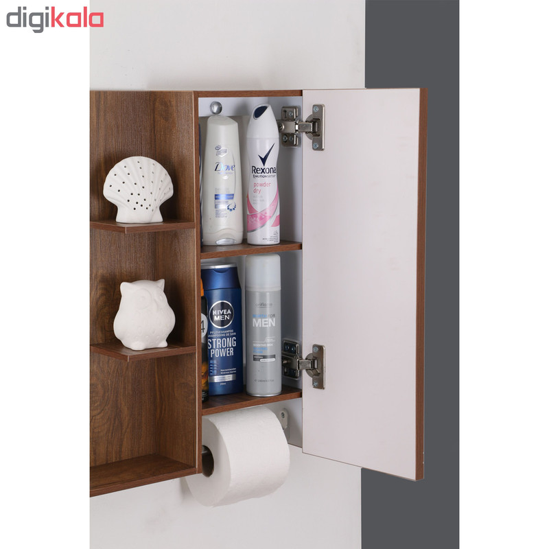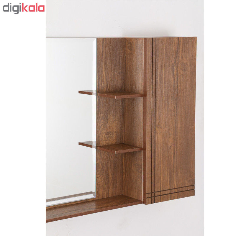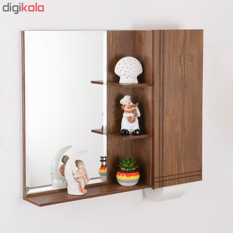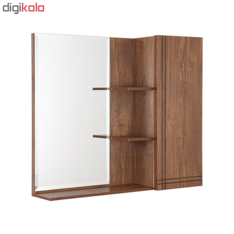 آینه و باکس دلفین کد 1024. این محصول ساخته شده از جنس پی وی‌سی و ضدآب است. طبقات بیرونی مناسب برای قرار دادن لوازم از جمله ادکلن،لوازم دکوری و آرایشی است. کابینت کنار آینه سایز و فضای مناسب برای استفاده را مهیا نموده است این محصول باید توسط پیچ و رول‌پلاک به دیوار نصب شود که متعلقات نصب همراه کالا ارسال می شود. آینه‌ی به‌کاررفته از نوع درجه یک سوپر کریستال بوده که پشت آینه نقره اندود شده است. تراش یک سانتی‌متری دور آینه باعث زیبایی و استحکام بیشتر لبه هاست. لولای کابین از نوع آرام بند بوده و استحکام طبقات برای قرار دادن وزن ‌های متعارف قابل‌قبول است. لایه رویی طرح چوب نیز از پی وی سی ساخته شده و مقاوم در برابر رطوبت است.