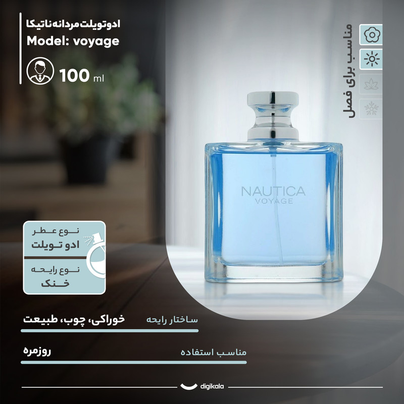 عطر مردانه Nautica Voyage که توسط Maurice Roucel در سال ۲۰۰۶ معرفی شد، مناسب مردانی پرانرژی، عاشق و مستقل است که زندگی را با قوانین خود میسازند. این عطر با رایحهای از گلهای دریایی و جنگل، حس تازگی و هیجان را منتقل میکند و ماندگاری بالایی دارد. ترکیب رایحههایش شامل برگهای سبز و سیب در آغاز، درخت گل ابریشم و نیلوفر آبی در قلب و کهربا، مشک، خزه و سرو در پایه است که تجربهای چندبعدی و جذاب به همراه دارد.