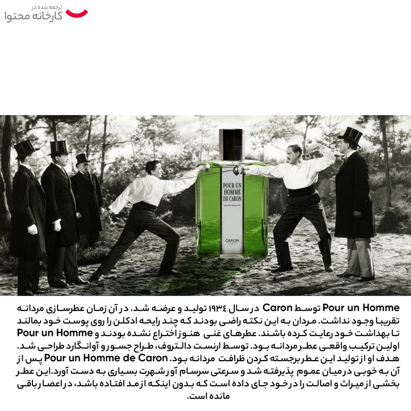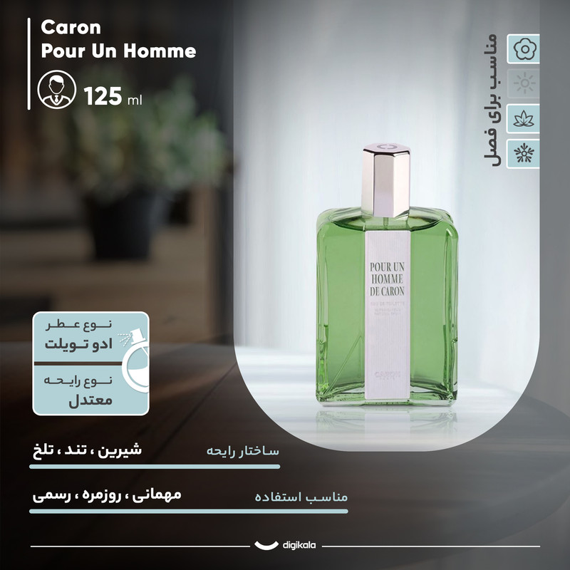یکی از عطرهای مردانه‌ی مهم برند مشهور «کرون» (Caron)، با نام «Pour Un Homme» شناخته می‌شود. این ادو تویلت حجمی برابر با 125 میلی‌لیتر دارد. عطر موردبحث در سال 1934، به کوشش عطرساز مشهور «ارنست دالتروف» (Ernest Daltroff) طراحی شد. یکی از بهترین انتخاب‌ها برای قرارهای عاشقانه یا جلسات مهم کاری شما، همین عطر تلخ کرون است. یکی از ویژگی‌های این ادو تویلت حجم 125میلی‌لیتری است که با توجه به قیمت منطقی آ...