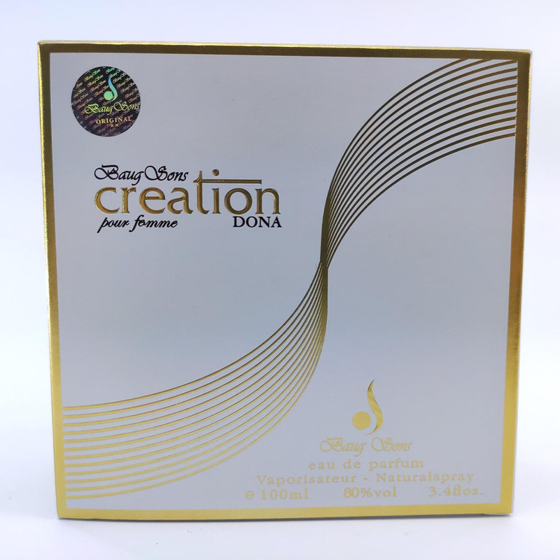 نت‌ آغازین عطر کریشن دونا مرکب از رایحه ترنج بوده و بعد از گذشت چند دقیقه و از بین رفتن این روایح می‌توان روایح نت‌ میانی که از گل رز بلغاری و زنبق تشکیل شده است را استشمام نمود و در نهایت نت پایانی مرکب از روایح نعناع هندی، چرم و وانیل است.مدت زمان ماندگاری این عطر مناسب بوده به گونه‌ای که بعد از گذشت چند ساعت نیز می‌توان روایح آن را استشمام نمود. عطر Creation Dona محصولی از برند مشهور باوگ سانز و ساخت کشور امارات است.