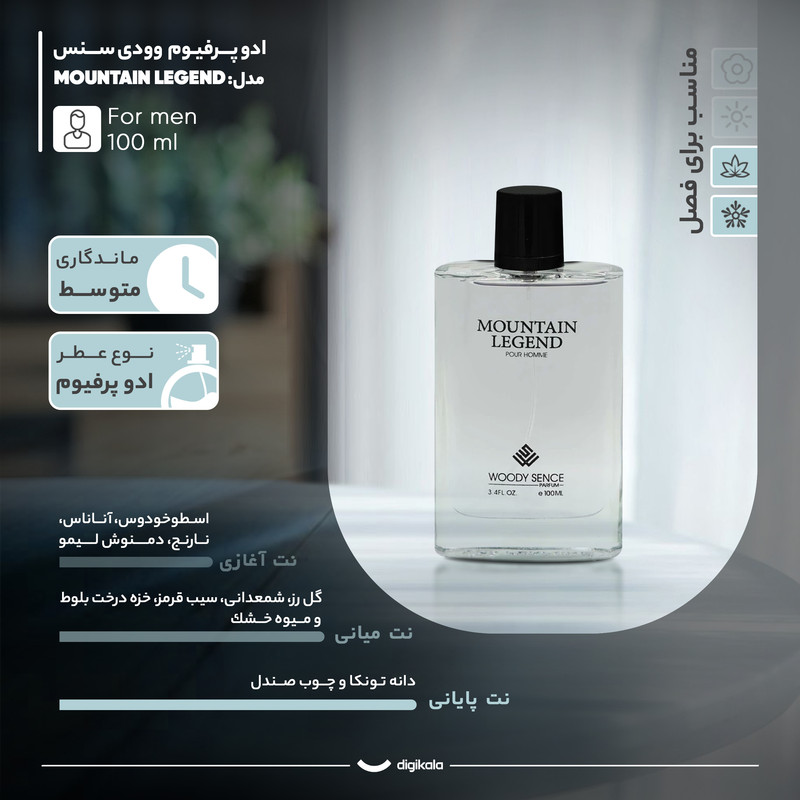 ادكلن MOUNTAIN LEGEND Woody Sence عطري است از خانواده بويايي مردانه و دردسته عطرهاي معطرومركباتي قرار دارد. رايحه ادكلن MOUNTAIN LEGEND Woody Sence برگرفته از رايحه ادكلن Legend برند Montblanc مي باشد، كه اين رايحه يكي ازمحبوب ترين و پرفروش ترين محصول سال 2011 در دنيا شناخته شد. ادكلن MOUNTAIN LEGEND Woody Senceعطري پرانرژي، فراموش نشدني و احساس برانگيز است و يكي از بهترين عطرهاي مردانه كه داراي اعتماد به نفس و ردي گيرا و دلفريب دارد.