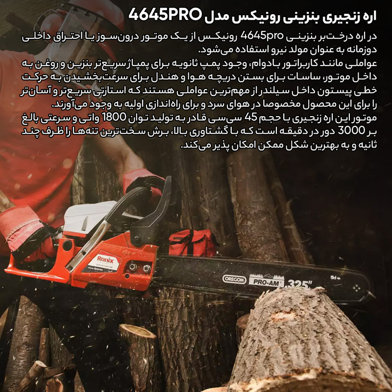 رونیکس که از عرضهکنندگان داخلی ابزار محسوب میشود، چند مدل از ارههای زنجیری را تولید و به بازار معرفی کرده است. مدل 4645Pro یکی از محصولات رونیکس به شمار میآید که نیروی خود را از یک موتور بنزینی با حجم 45 سیسی با قدرت 1800 وات تامین میکند. موتور این اره جهت سهولت روشن شدن به سیستم استارت آسان نیز مجهز شده و میتواند با سرعت 3200 دوربردقیقه کار کند. یک مخزن سوخت 550 میلیلیتر هم برای این اره...