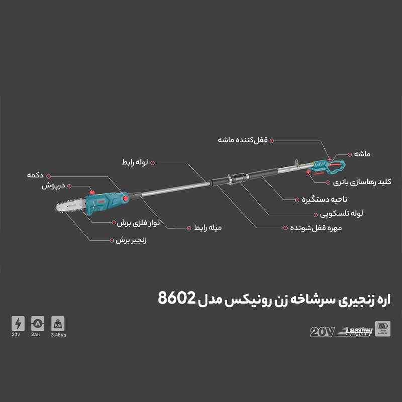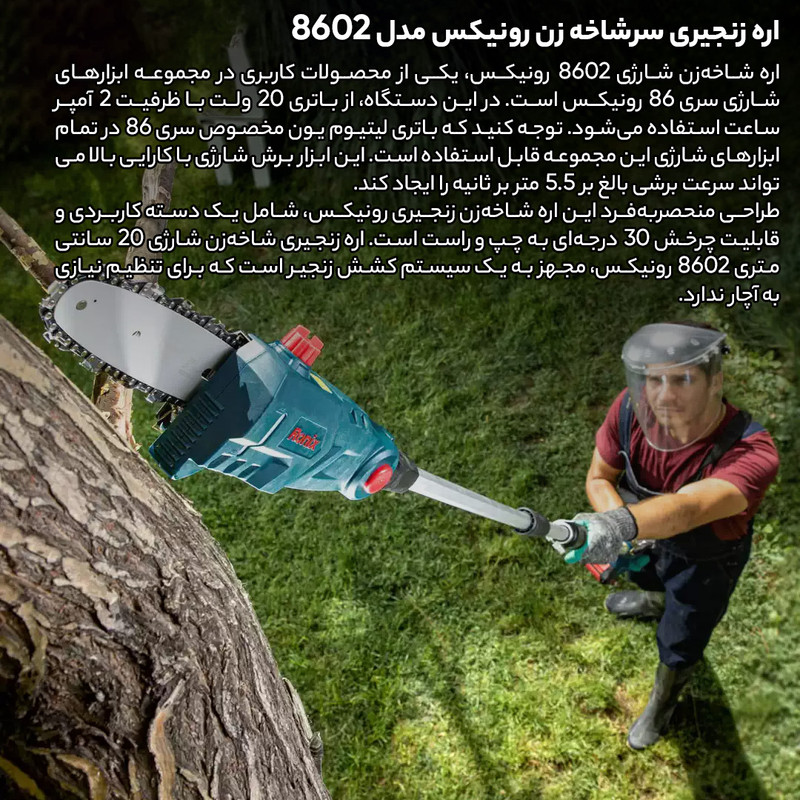 اره شاخهزن شارژی 8602 رونیکس، یکی از محصولات کاربری در مجموعه ابزارهای شارژی سری 86 رونیکس است. در این دستگاه، از باتری 20 ولت با ظرفیت 2 آمپر ساعت استفاده میشود. توجه کنید که باتری لیتیوم یون مخصوص سری 86 در تمام ابزارهای شارژی این مجموعه قابل استفاده است. این ابزار برش شارژی با کارایی بالا میتواند سرعت برشی بالغ بر 5.5 متر بر ثانیه را ایجاد کند.