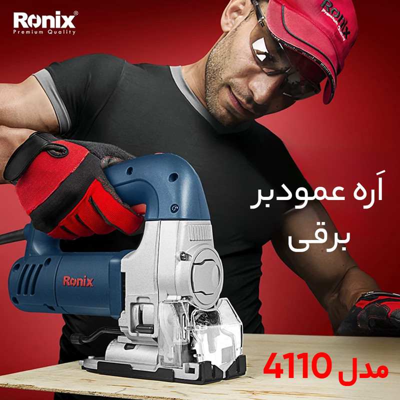 اره‌ی عمودبر مدل 4110 ساخت شرکت «رونیکس»  (Ronix)است که با توان 600 وات کار می‌کند. این محصول برای برش قطعات چوب، نئوپان، لترون، HBF و MDF به کار می‌رود. همچنین برخی برش‌های سبک فلزات با این دستگاه امکان‌پذیر است. این اره با داشتن ظرفیت برش تا 130 میلی‌متر برای چوب و 10 میلی‌متر برای فلزات برای مصارف خانگی و تجاری مناسب به نظر می‌رسد. در ساخت این دستگاه از موتوری با قدرت مناسب استفاده‌شده و کیفیت قابل‌قبولی در ساخت این دستگاه به‌کاررفته است. این محصول قابلیت برش زاویه را هم دارد. همچنین برای جلوگیری از پخش شدن گردوغبار قابلیتی روی بدنه‌ی 4110 در نظر گرفته‌شده است. در ساخت موتور دستگاه، شاخص‌های استاندارد‌ CE اروپا را در نظر می‌گیرند. سرعت حرکت رفت و برگشتی تیغه تا 2500 بار در دقیقه می‌رسد. با استفاده از ولوم روی دسته امکان تنظیم سرعت در 6 حالت مختلف وجود دارد. برای این مدل، قابلیت برش تا زاویه‌ی 45 درجه هم در نظر گرفته‌شده است. اگر می‌خواهید از پخش شدن گردوغبار، خاک‌اره یا پلیسه‌های فلزی جلوگیری کنید، امکان اتصال این مدل به جاروی برقی یا مکنده‌های هوا - به کمک مبدل مخصوص که به همراه دستگاه در اختیار خریدار قرار می‌گیرد - وجود دارد. استفاده و کاربرد این دستگاه بیشتر در کارگاه‌های نجاری و یا در ساخت دکوراسیون چوبی است. اگر اره عمودبر 4110 را تهیه کردید، دقت کنید که در کیف محصول، علاوه بر دستگاه، یک آچار آلن (متصل به بدنه‌ی دستگاه)، یک تیغه مخصوص برش چوب و دفترچه‌ی راهنمای دستگاه هم باشند. اره‌ی عمودبر دستگاهی است که در آن تیغه در راستای عمود حرکت کرده و برش انجام می‌شود. اره عمود بر دارای تیغه‌ی مخصوصی است که در دو نوع چوب‌بر یا فلز‌بر تولید می‌شود. با اتصال تیغه‌ی موردنظر و روشن کردن دستگاه، تیغه به‌صورت عمودی حرکتی رفت‌وبرگشتی دارد.