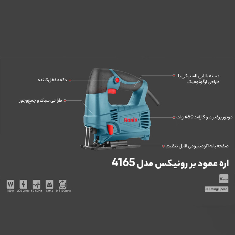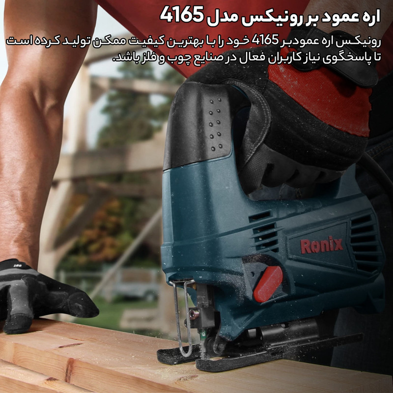 اره‌ی عمودبر مدل 4165 دستگاهی است که برش را با حرکت عمودی تیغه انجام می‌دهد. این اره را شرکت «رونیکس» (Ronix) می‌سازد. در ساخت این دستگاه از موتوری با قدرت مناسب استفاده‌شده و کیفیت قابل‌قبولی در ساخت این دستگاه به‌کاررفته است. این محصول قابلیت برش زاویه را هم دارد. همچنین برای جلوگیری از پخش شدن گردوغبار قابلیتی روی بدنه‌ی دستگاه در نظر گرفته‌شده است. اره عمود بر دارای تیغه‌ی مخصوصی است که در دو نوع چوب‌بر یا فلز‌بر تولید می‌شود. با اتصال تیغه‌ی موردنظر و روشن کردن دستگاه، تیغه به‌صورت عمودی حرکتی رفت‌وبرگشتی دارد. مدل 4165، وزنی در حدود 2 کیلوگرم و موتوری با قدرت 240 وات دارد. در ساخت موتور دستگاه، شاخص‌های استاندارد‌ CE اروپا را در نظر می‌گیرند. سرعت حرکت رفت و برگشتی تیغه تا 3100 بار در دقیقه می‌رسد. با این دستگاه می‌توانید قطعات چوبی و فلزی را به ترتیب تا قطر 65 و 6 میلی‌متر برش دهید. برای این مدل، قابلیت برش تا زاویه‌ی 45 درجه در نظر گرفته‌شده است. همچنین سرعت موتور وابسته به میزان فشار کاربر به شستی دستگاه بستگی دارد. اگر می‌خواهید از پخش شدن گردوغبار، خاک‌اره یا پلیسه‌های فلزی جلوگیری کنید، امکان اتصال این مدل به جاروی برقی یا مکنده‌های هوا وجود دارد. استفاده و کاربرد این دستگاه بیشتر در کارگاه‌های نجاری و یا در ساخت دکوراسیون چوبی است. اگر مدل 4165 را که با توان 240 وات و برای برش چوب یا فلز طراحی‌شده تهیه کنید، دقت کنید که در کارتن محصول، علاوه بر دستگاه، یک آچار آلن (متصل به بدنه‌ی دستگاه)، یک تیغه مخصوص برش چوب و دفترچه‌ی راهنمای دستگاه هم باشند.
