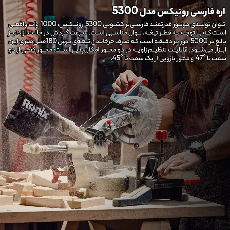 فارسیبرهای کشویی رونیکس از معتبرترین و باکیفیتترین ابزارهای قدرتمند برش در نجاری و صنعت چوب هستند. توان تولیدی موتور قدرتمند فارسیبر کشویی 5300 رونیکس، 1000 وات واقعی است که با توجه به قطر تیغه، توان مناسبی است. سرعت گردش در حالت آزاد نیز بالغ بر 5000 دور بر دقیقه است که صرف چرخاندن تیغهی برش 180میلیمتری این ابزار میشود. قابلیت تنظیم زاویه در دو محور امکانپذیر است: محور کفی از دو سمت تا °47 و محور بازویی از یک سمت تا °45.برای سهولت در استفاده و حمل و نقل دسته این فارسی بر D شکل است .از دیگر ویژگی های این فارسی بر سیستم قفل کن پیشرفته کفی برای تنظیم زوایای برش در 9 حالت می باشد .