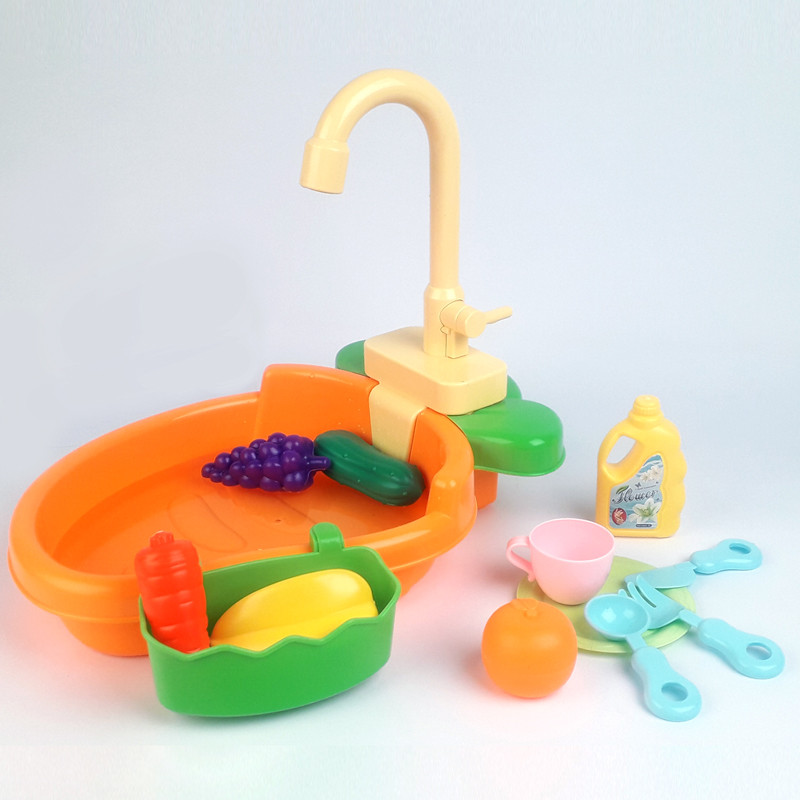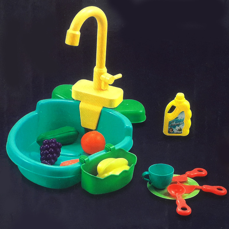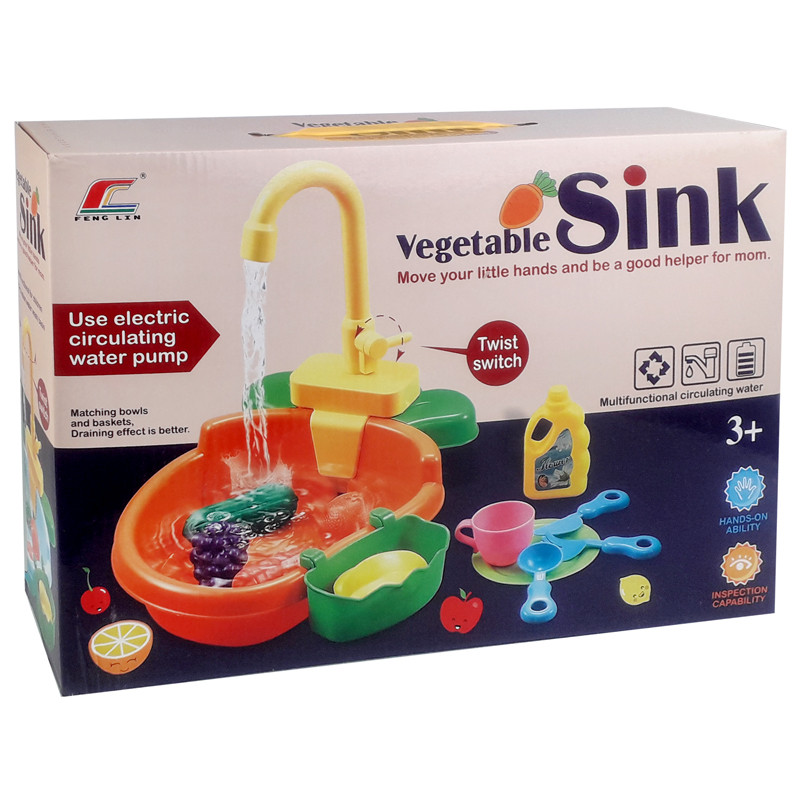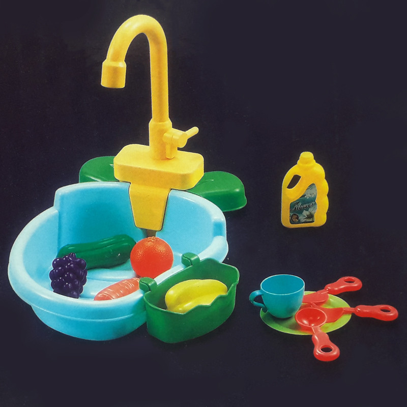 سینک ظرفشویی باتری خور با جریان آب واقعی میباشد. با دو باتری قلمی کار میکند که حتما باید تازه باشند تا پمپ کار کند. شیر گردان دارد و همراه با فنجان و بشقاب و چاقو و چنگال میباشد. همراه با 4 میوه و سبزیجات و یک دبه شوینده اسباب بازی میباشد. لگن زیر سینک را تا ارتفاع کافی پر آب کنید تا آب از شیر جریان پیدا کند (ارتفاع آب به حدی برسد که پمپ آب زیر شیر بتواند آب را بشکد در داخل خودش). با چرخاندن اهرم...