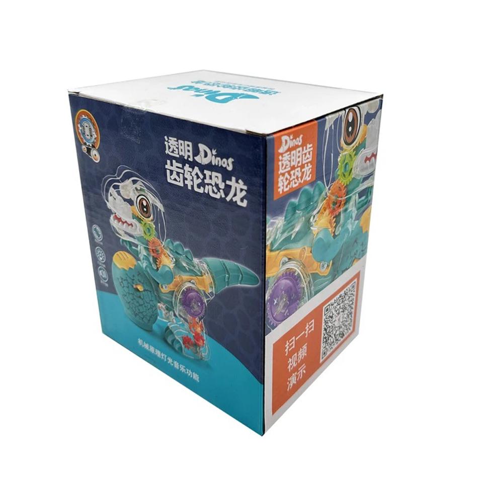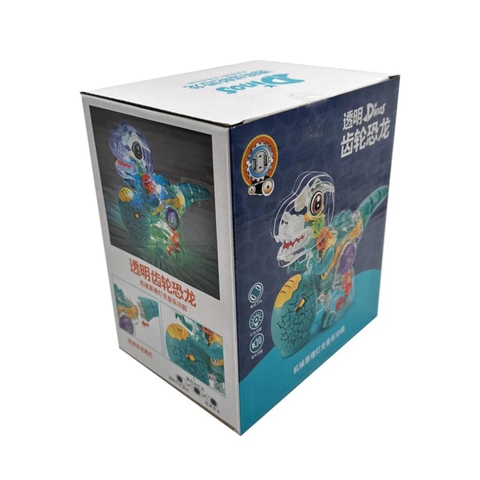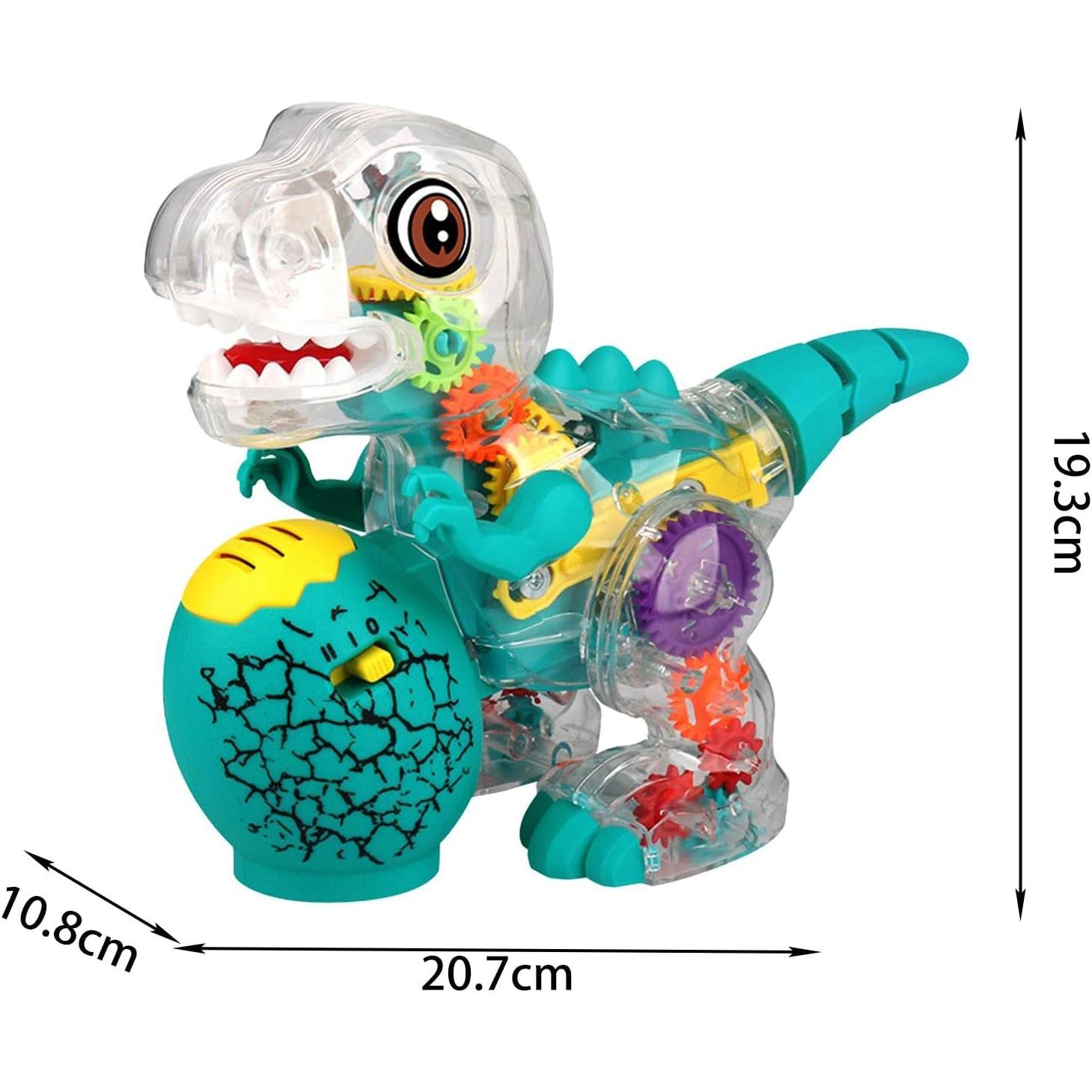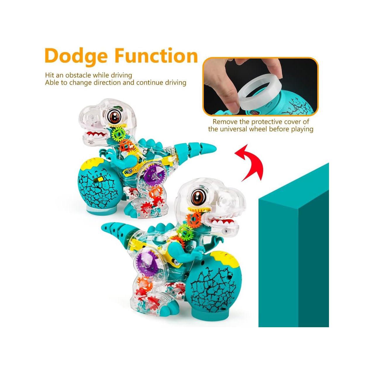 اسباب بازی دایناسور چرخدنده ای که با 3 عدد باطری قلمی کار می کند، دارای دکمه روشن و خاموش 3 حالته می باشد، دکمه خاموش، دکمه فقط چراغ روشن و دکمه چراغ و موزیک و حرکت روشن، این دایناسور حرکتی با برخورد به موانع تغییر مسیر داده و همچنین چرخدنده های آن حرکت می کند.