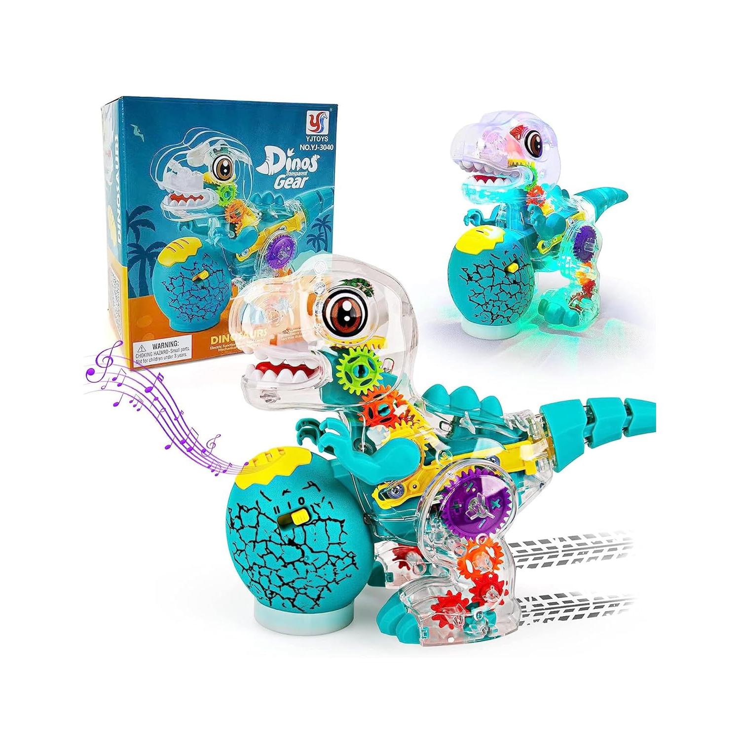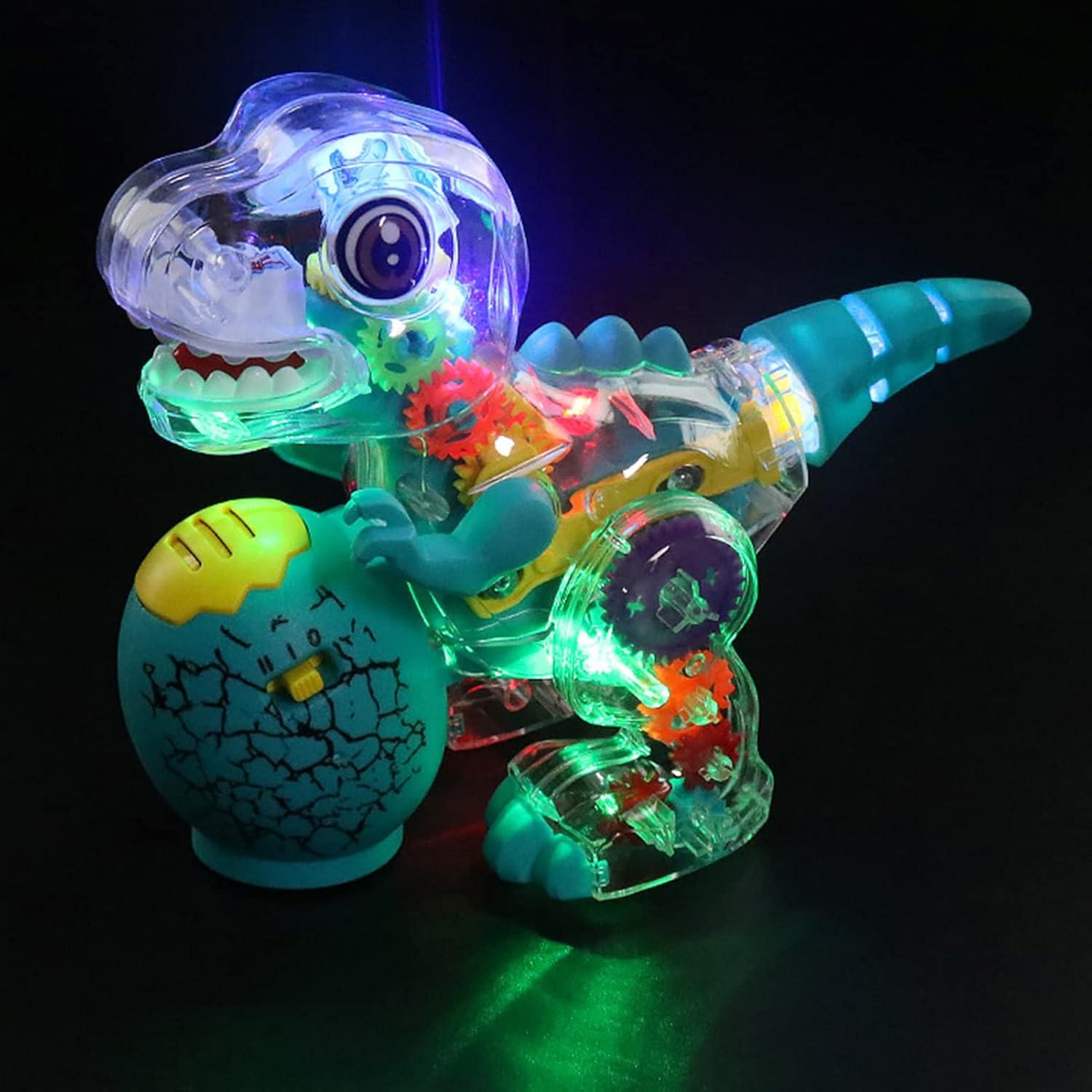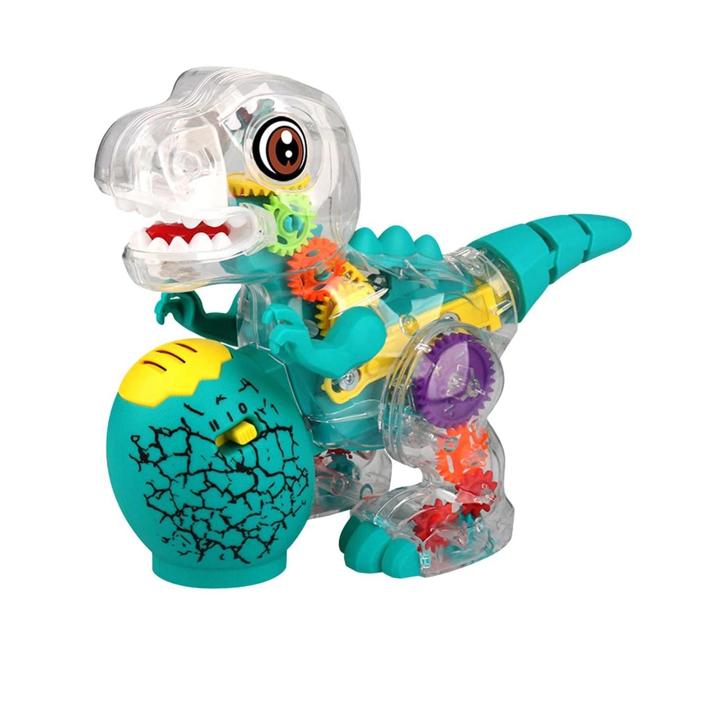 اسباب بازی دایناسور چرخدنده ای که با 3 عدد باطری قلمی کار می کند، دارای دکمه روشن و خاموش 3 حالته می باشد، دکمه خاموش، دکمه فقط چراغ روشن و دکمه چراغ و موزیک و حرکت روشن، این دایناسور حرکتی با برخورد به موانع تغییر مسیر داده و همچنین چرخدنده های آن حرکت می کند.