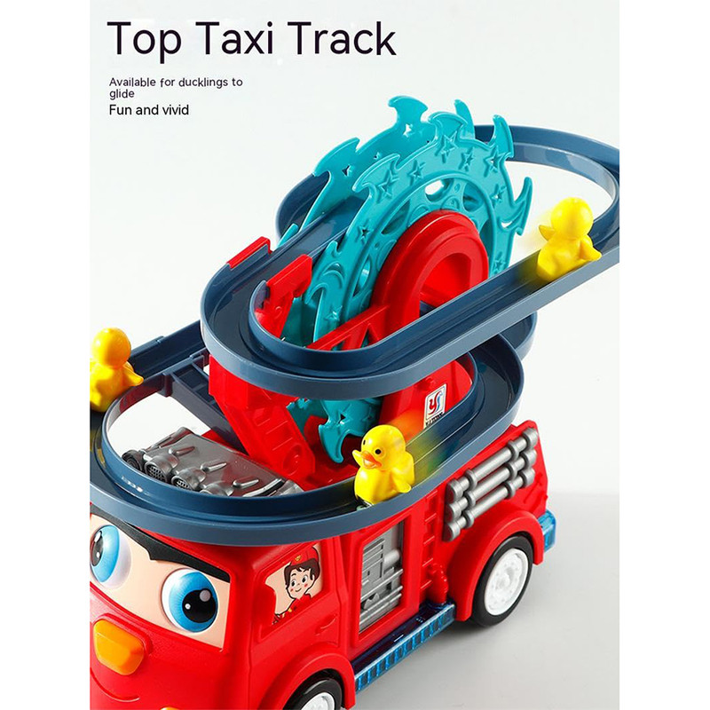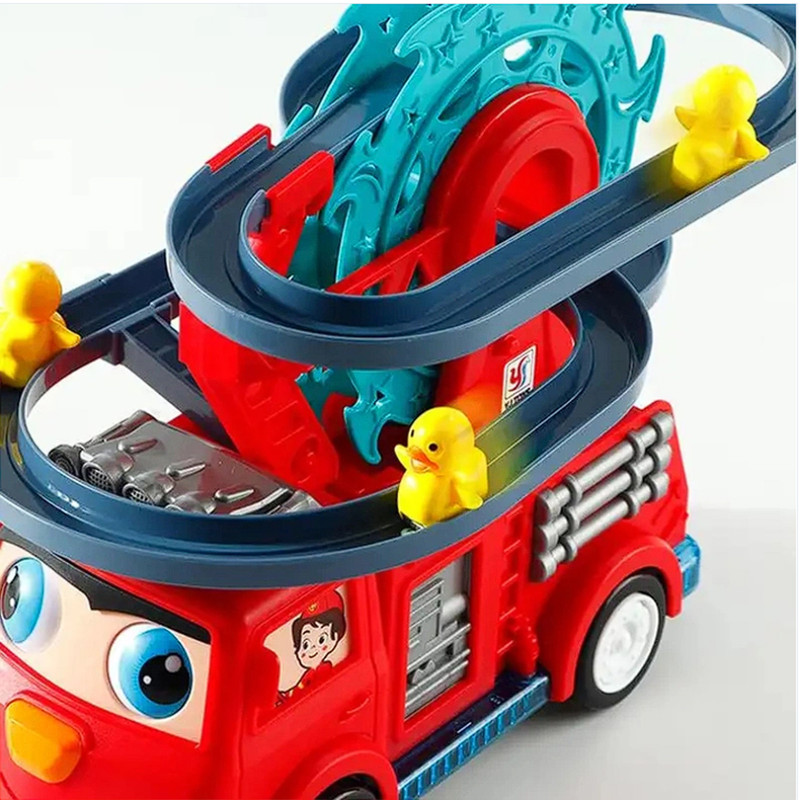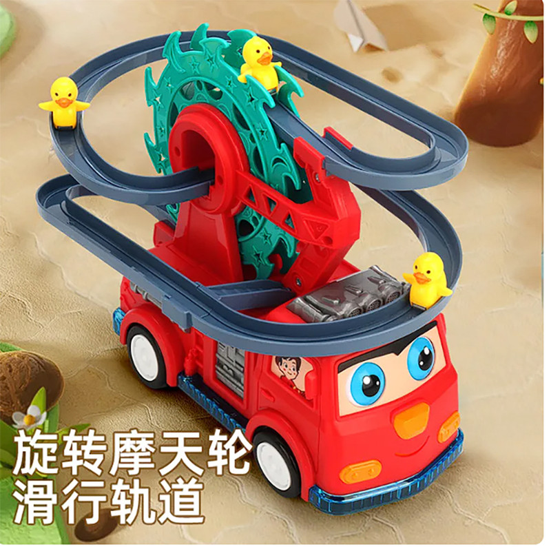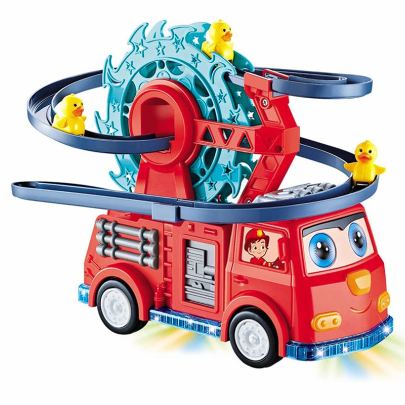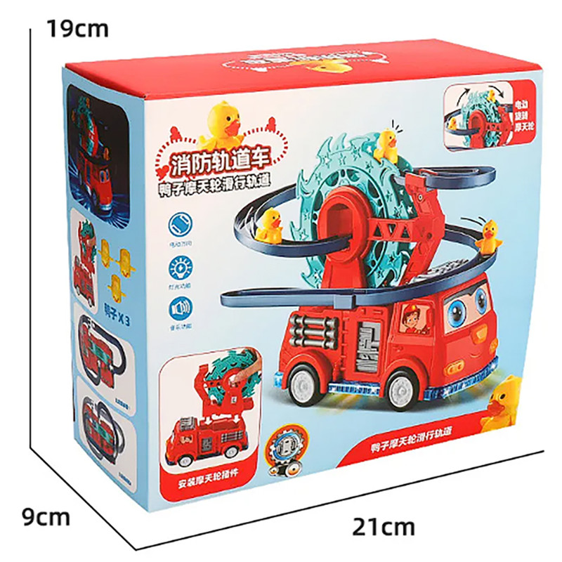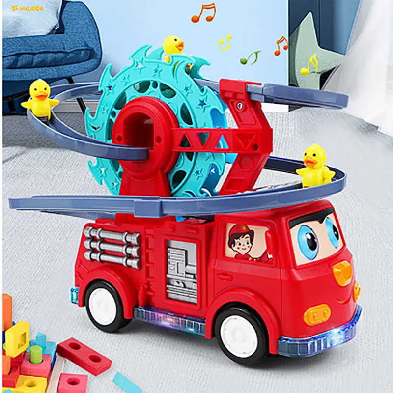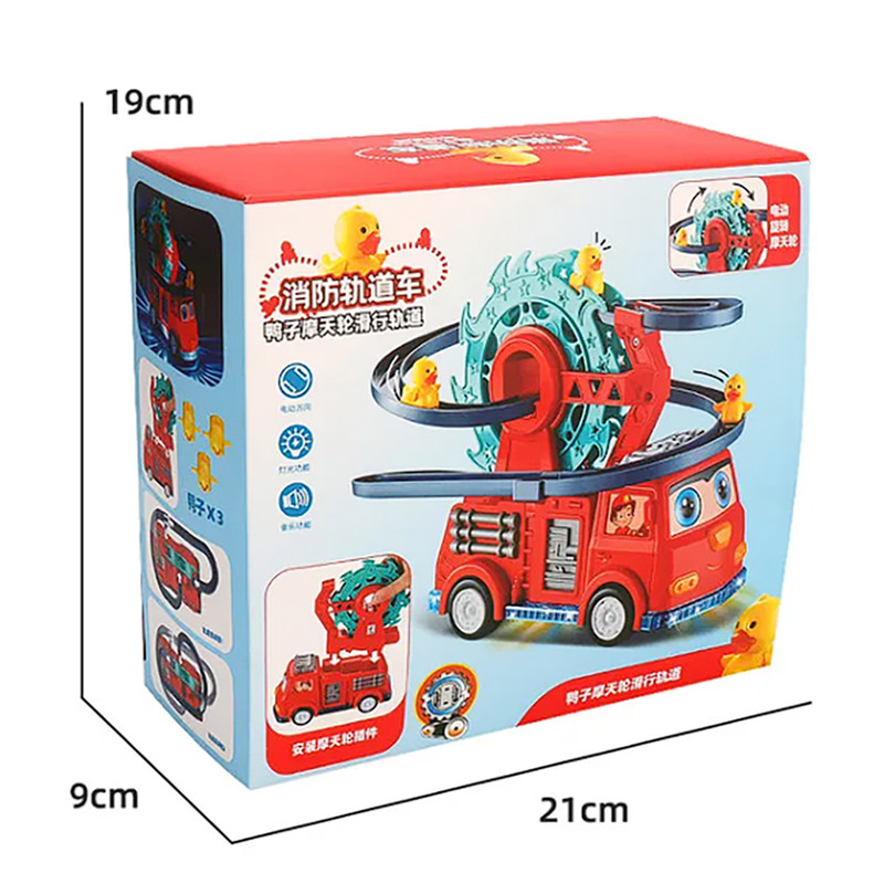 این محصول یک ماشین پله در طرح ماشین آتش نشانی می باشد که چندین عروسک اردک در مسیری که روی ماشین به صورت سرسره وجود دارد نصب می شود و اردک ها به صورت خودکار از پله ها بالا آمده و در مسیر سرسره حرکت می کنند و دوباره به نقطه اولیه بازمیگردند.این ماشین دارای چرخی در زیر ماشین است که که قابلیت چرخش 360 درجه دارد و هنگام برخورد با موانع تغییر مسیر می دهد.از دیگر ویژگی های این محصول نورپردازی سه بعدی و موسیقی متنوع، است که توجه کودکان را جلب کرده و آنها را مجذوب خود میکند.دیگر ویژگی این محصول حرکت کردن چشم های جلوی ماشین به هنگام روشن کردن می باشد.این محصول با داشتن بسته بندی مناسب برای کودکان بالای 3 سال می باشد و می تواند هدیه ای زیبا و جذاب برای کودکان عزیز شما باشد.