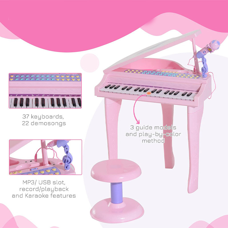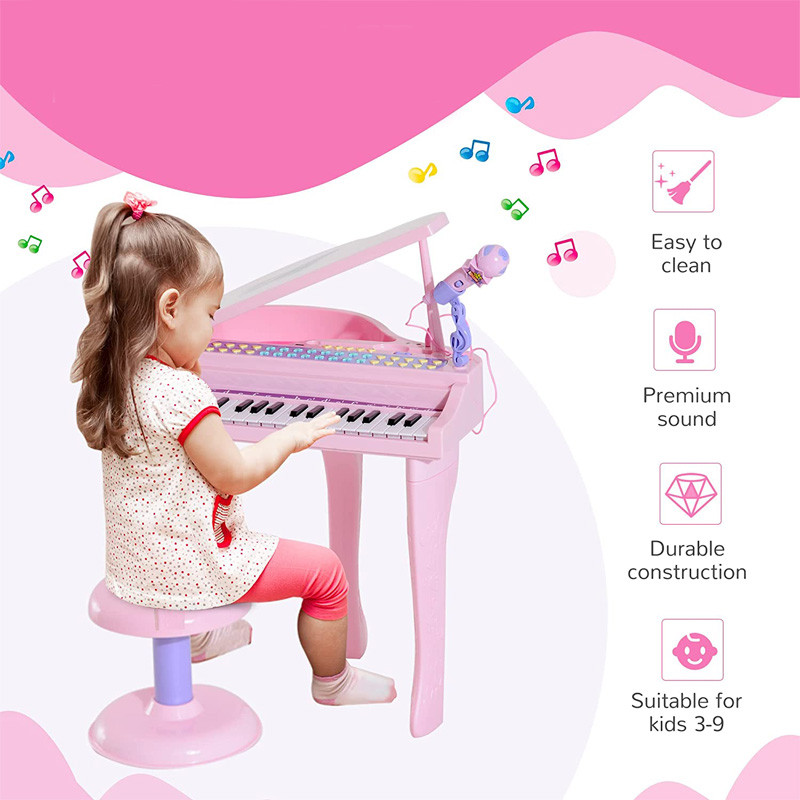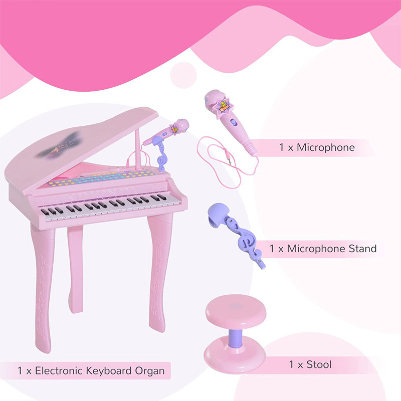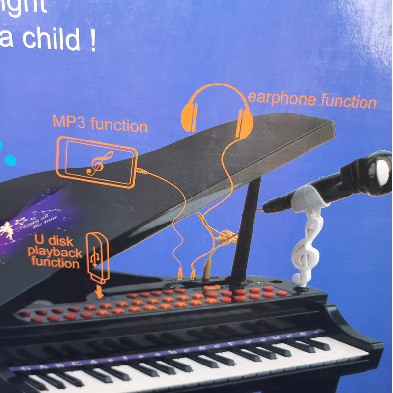 سایر توضیحات - پیانو پایه دار با صندلی - موزیکال - چراغ دار - دارای میکروفون - دارای کلید دمو - قابلیت ضبط و پخش آهنگ - قابلیت تنظیم صدا - دارای خروجی USB جهت اتصال به لپ تاپ - دارای خروجی AUX جهت اتصال به موبایل - دارای بولوتوث - نیاز به 4 عدد باتری قلمی - درب روی پیانو به صورت دستی باز و بسته میشود - قابلیت پخش موسیقی از طریق اتصال به موبایل و لپ تاپ - قابلیت اتصال هدفون