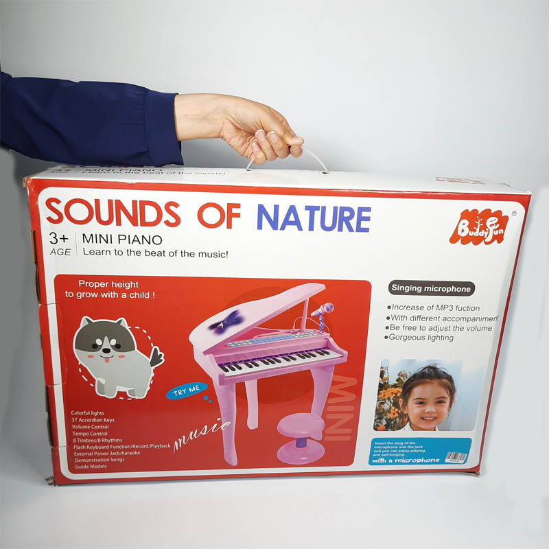 سایر توضیحات- پیانو پایه دار با صندلی - موزیکال - چراغ دار - دارای میکروفون - دارای کلید دمو - قابلیت ضبط و پخش آهنگ - قابلیت تنظیم صدا - دارای خروجی USB جهت اتصال به لپ تاپ - دارای خروجی AUX جهت اتصال به موبایل - دارای بولوتوث - نیاز به 4 عدد باتری قلمی - درب روی پیانو به صورت دستی باز و بسته میشود - قابلیت پخش موسیقی از طریق اتصال به موبایل و لپ تاپ - قابلیت اتصال هدفون