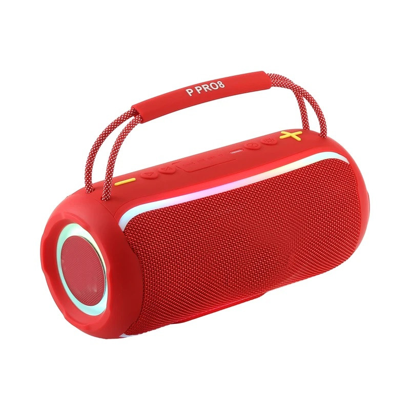 اسپیکر بلوتوثی قابل حمل P Pro-8 با استفاده از کابل Type-C همراه پکیج شارژ می شود. با هر مرتبه شارژ کامل می توانید 12 ساعت از آن استفاده کنید. هر بار شارژ کامل 2 ساعت طول می کشد. توان اسپیکر 20 وات است. این اسپیکر دارای چراغ LED است که باعث زیبایی بیشتر آن شده است. همچنین بلوتوث این اسپیکر تا شعاع حدود 10 متری را پشتیبانی می نماید. این اسپیکر دارای پورت AUX و محل مخصوص رم است که با یک محفظه سیلیکونی پوشانده شده اند تا رطوبت و غبار وارد آن نشود. همچنین یک دکمه برای کنترل نور تعبیه شده است. با استفاده از دفترچه راهنما می توانید عملکرد اسپیکر را کاملا متوجه شوید.