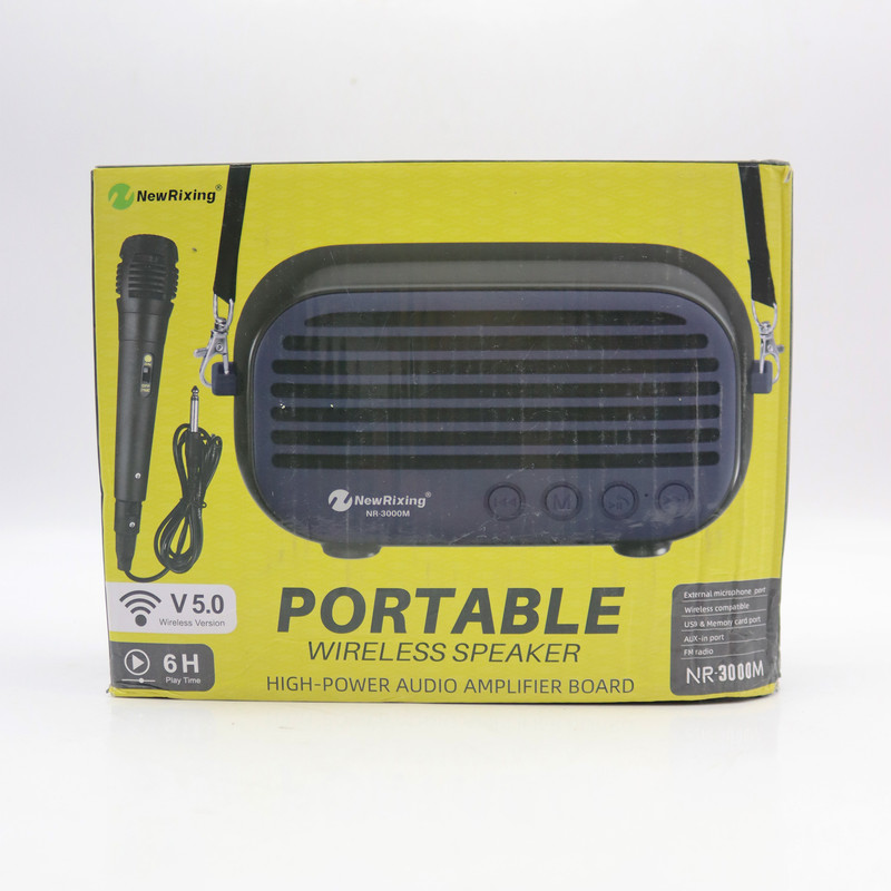 اسپیکر «NR-3000M» محصولی از شرکت «NewRixing» است که به صورت بیسیم و از طریق فناوری بلوتوث به تلفنهمراه یا پخشکنندهی صوتی متصل میشود. طراحی این اسپیکر بسیار حرفهای است و به صورت 360 درجه و با قدرت بالا اقدام به پخش موسیقی میکند. این اسپیکر شرکت NewRixing دارای دو ووفر با سایز 3.5 اینچ است که به یاری آنها میتوان شاهد تولید صدایی شفاف و با بیس مناسب بود. فرکانس پاسخگویی اسپیکر NR-3000M شرکت نیورکسینگ برابر با بازهی 100 هرتز تا 20 کیلوهرتز است. اسپیکر NR-3000M را میتوان به صورت همزمان به دو تلفنهمراه یا تبلت متصل کرد. اسپیکر NR-3000M انرژی مورد نیاز خود را از طریق باتری داخلی با ظرفیت 1200 میلیآمپر تامین میکند. به کمک این باتری میتوان تا 6 ساعت به پخشموسیقی به صورت مداوم پرداخت. اسپیکر NR-3000M دارای یک میکروفن هست که به همراه اسپیکر در جعبه کالا قرار داده شده است که میتوان از آن با این اسپیکر استفاده کرد و لذت برد .