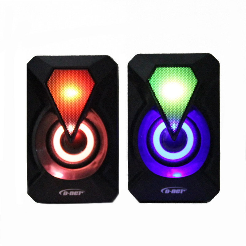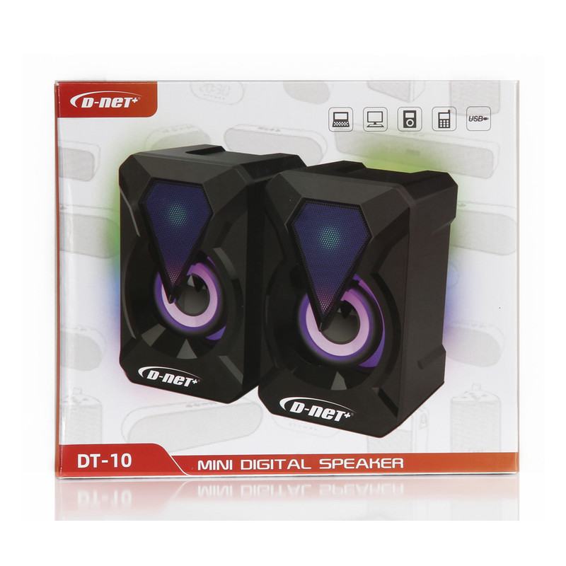 اسپیکر دو تکه دی نت قابلیت اتصال به لپ تاپ و کامپیوتر را دارد و دارای نور پردازی زیباییست که جذابیت محصول را دو چندان کرده و برای مصارف خانگی مناسب است.