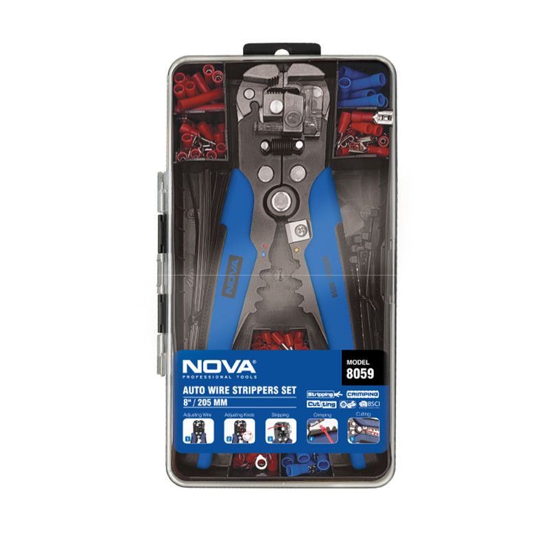 ست سیم لخت کن اتوماتیک چندکاره 8 اینچ مدل 8059 نووا، یکی از باکیفیت ترین ابزارهای موجود در بازار است که با بهرهگیری از جدیدترین تکنولوژی روز دنیا و بهترین متریال تولید شده و برای کاربران حرفهای و خانگی بهترین گزینه محسوب میشود. این ابزار به صورت اتوماتیک عمل کرده و نیازی به هیچگونه تنظیمات دستی ندارد، که این ویژگی باعث افزایش سرعت و دقت در انجام کارها شده است. تیغههای بسیار مقاوم این سیم لخت کن از جنس فولاد SK5 ساخته شدهاند. همچنین، این ابزار دارای روکش رنگ پودری است که به مقاومت آن در برابر سایش و خوردگی کمک میکند و باعث افزایش عمر مفید ابزار میشود. این مجموعه حرفهای شامل 200 عدد انواع ترمینال و پایههای عایق برش خورده و آماده است که به کاربران این امکان را میدهد که تمامی اتصالات مورد نیاز را به سرعت و بدون نیاز به ابزارهای اضافی انجام دهند. تمامی این ابزارها و قطعات در یک محفظه پلاستیکی تقسیمبندی شده قرار دارند که به راحتی قابل حمل و استفاده است.