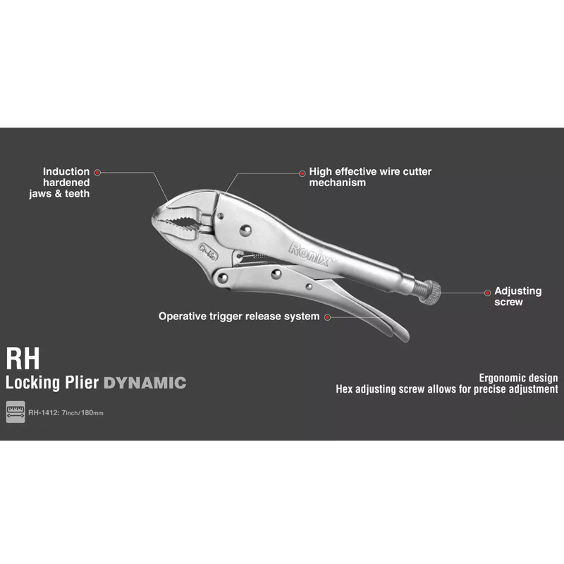 فک‌ها در انبر قفلی رونیکس مدل 1412 سایز 7 اینچ، منحنی‌شکل و سخت‌کاری‌شده هستند و مطابق با استاندارد DIN ساخته شده‌اند که مقاومت سایشی و قدرت گیرایی این ابزار را دوچندان کرده و به ثابت نگه‌داشتن قطعه‌ کار کمک می‌کنند. سیستم قفل‌کن ماشه انبر، قدرت زیادی برای ثابت نگه داشتن قطعه کار به شما خواهد داد.