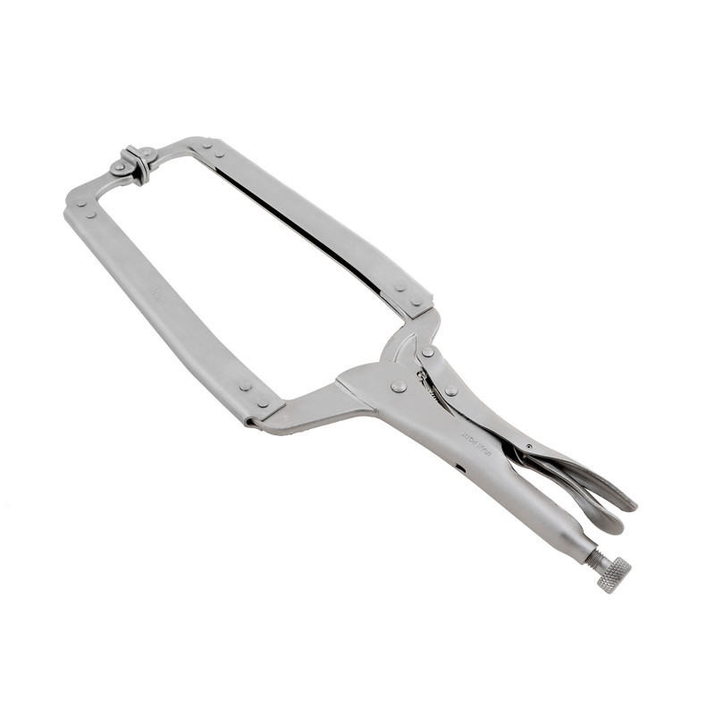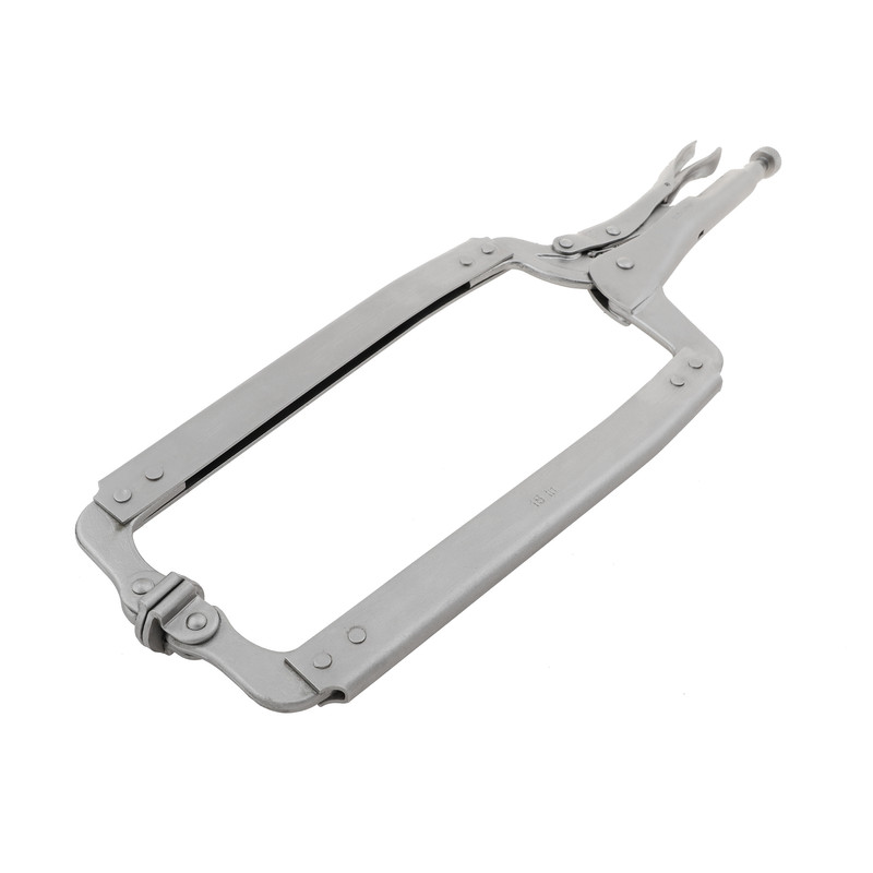 سایر توضیحات - انبر قفلی C شکل هماهنگ شونده ایران پتک سایز 18 اینچ - این انبر به واسطه داشتن صفحات متحرک در نوک فک ها امکان انطباق با سطوح قطعات را دارا می باشد و بدون هیچ اثرگذاری بر روی سطوح قطعات قفل می شود - فک ها از فولاد ابزاری بوده و به روش فورج ساخته شده و کاملا سخت کاری می شوند - از مکانیزم قفل قدرتمند جهت اعمال فشار های بالا برای گرفتن قطعات برخوردار می باشد - تمام قطعات دارای پوشش نیکل می باشند - مطابق با استاندارد ملی ایران به شماره 9223