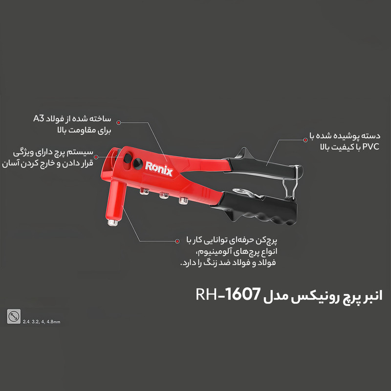 | سایر توضیحات | یک پرچ دستی شامل 4 سری قابل تعویض در سایزهای 2.4 ، 3.2 ، 4 و 4.8 میلی متر - طراحی شده برای کار با پرچهای 2.4 اینچ تا 4.8 میلیمتر مناسب برای انجام انواع پرچکاریها - دارای سیستم پرچ متمایز جهت پرچ هر چه سریعتر و دفع آسان اضافات میخ پرچ - دارای فنری مقاوم و دستهای با روکش PVC جهت افزایش دقت و استحکام پرچکاریها - دارای بدنهای تمام استیل با دوام و ماندگاری بالا - مجهز به نازلی بلند جهت انجام کار در مکانهای تنگ و باریک با دسترسی دشوار - ابزاری مناسب برای انجام پرچ کاریهای کلی، ساخت ناودان، مبلمان، بوم نقاشی و... - پرچی حرفهای که میتواند از هر سه نوع میخ پرچ آلومینیومی، فولادی و استیل استفاده کند - مجهز به دستهای ارگونومیک با روکش PVC ضدلغزش جهت افزایش سهولت کاربریهای طولانی مدت - طراحی منحصربفرد دسته جهت فراهم آوری نیروی کافی برای پرچ مهرههای مختلف |