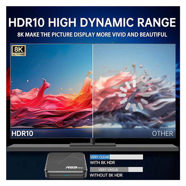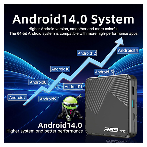 اندروید باکس R69 PRO با طراحی جمع و جور ارائه شده که دارای ابعاد 8×8×2 سانتیمتر و وزن 200 گرم است که سبک بوده و برای حمل آن به هیچ عنوان اذیت نخواهید شد. این محصول با داشتن پردازنده ALWINNER H728 هشت هسته ای با فرکانس تا حدود 2.2GHZ است و پردازشگر گرافیکی MALI-G57 MC1 میتواند کارایی بالا و بدون دردسری برای شما داشته باشد. با داشتن سیستم عامل اندروید 14 استفاده ی بروزی از آن خواهید داشت. این نسخه از دستگاه دارای 4 گیگابایت رم و 64 گیگابایت حافظه داخلی است . سخت افزار ان نسبتا بروز بوده و گرافیک بسیار مناسب برای کاربرد های مختلف پخش ویدیو , استفاده خانگی دارد. بلوتوث 5.0 و WIFI 6 مزیتی برای ارتباطات بی سیم دارد. این اندروید باکس با توجه به مشخصات مناسبی که دارد و قیمت آن گزینه مقرون به صرفه ای است.