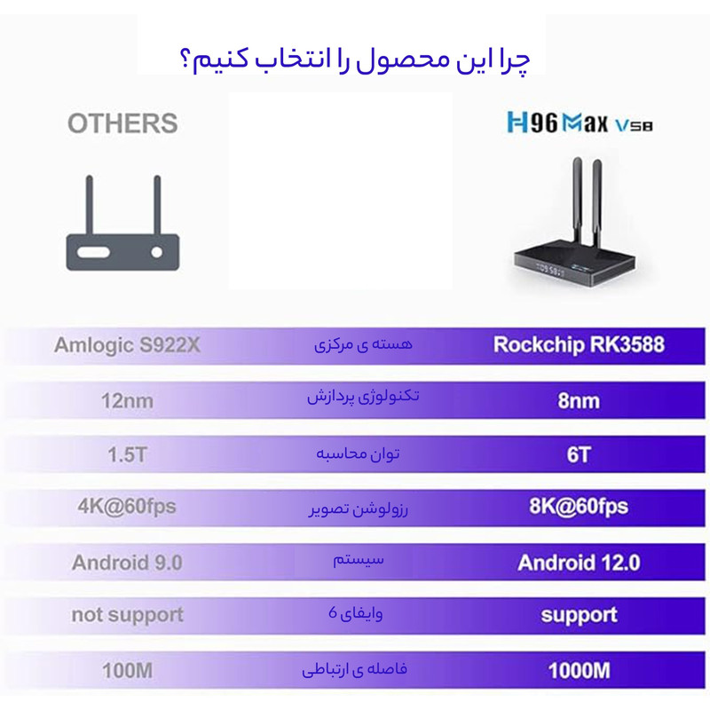 اندروید باکس جدید و قدرتمند H96 Max V58 با تراشه هشت هسته ای Rockchip RK3588 که تاکنون تنها در کیت‌ها و بردهای رشد دیده‌ایم. این تراشه در اندازه 8 نانومتر ساخته شده و دارای چهار هسته CPU ARM Cortex-A76 با سرعت 2.6 گیگاهرتز، چهار هسته Cortex-A55 با سرعت 1.8 گیگاهرتز، گرافیک قدرتمند Mali-G610 MP4 و شتاب دهنده هوش مصنوعی با پشتیبانی از حداکثر 6 گیگاهرتز است. کارایی. این پردازنده علاوه بر رمزگشایی 4K@60fps، همچنین رمزگشایی 8K@60fps H.265 و رمزگشایی VP9 را ارائه می‌کند. V58 8K RK3588 TV Box روی سیستم عامل اندروید 12 اجرا می شود. در داخل، ما همچنین با بهره گیری از 8 گیگابایت رم DDR4 و همچنین 64 گیگابایت حافظه eMMC پیدا می کنیم. علاوه بر این، دستگاه از Wifi Dual Band 6 802.11ax، بلوتوث 5.0 و Gigabit Ethernet پشتیبانی می کند. در میان پورت‌های ورودی/خروجی می‌توان از جمله پورت DC برای آداپتور برق ،5V/2A، USB 3.0، USB 2.0 ،Type-A SPDIF نوری، HDMI 2.0a (خروجی 8K@60Hz) و پورت RJ45 پیدا کرد.