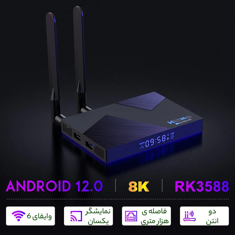 امکانات و قابلیت‌هاسیستم عامل اندروید 12.0 پشتیبانی از HDR HDR10 و HLG خروجی ویدیو با وضوح بالا 8K @60HZ (7680×4320 پیکسل) رم 8 گیگابایت LPDDR4 و فضای ذخیره سازی 64 گیگابایت eMMc شبکه اترنت: 10/100/1000 WiFi6 2.4G/5G(ax) بلوتوث 5.0 پشتیبانی IR پشتیبانی از خروجی صدای دیجیتال SPDIF پشتیبانی از فرمت های ویدئویی سه بعدی میزبان USB 3.0 با سرعت بالا پشتیبانی از قابلیت تصویر آینه MIRACAST، DLNA پشتیبانی از انواع دستگاه های جانبی مانند ایرموس ، کیبورد ، دسته بازی و.....
