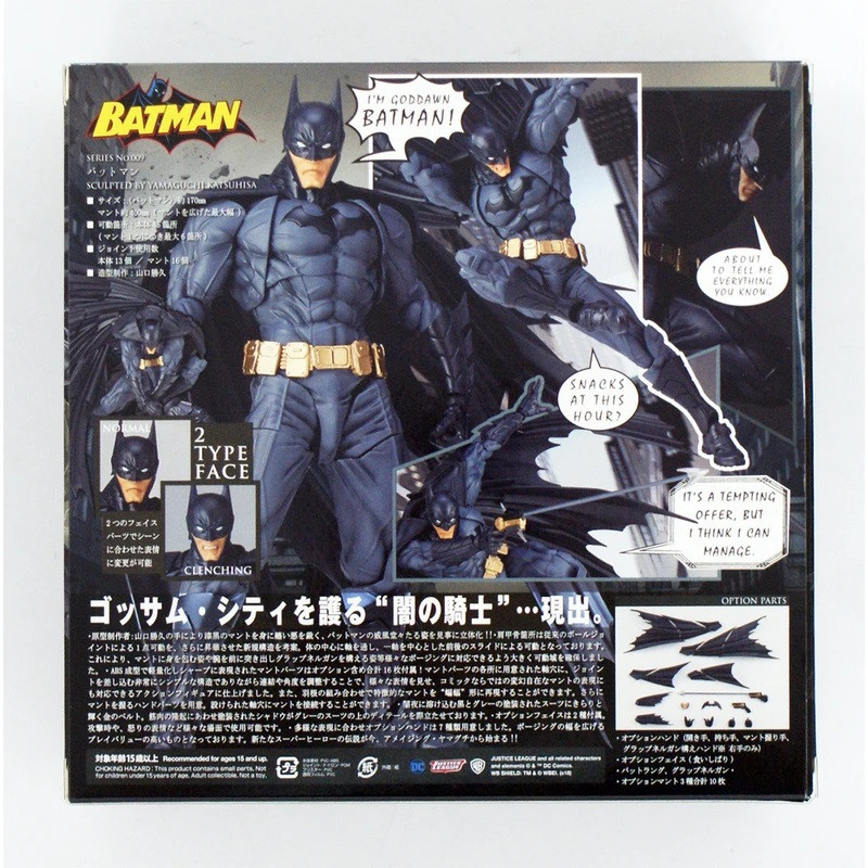 | سایر توضیحات | اکشن فیگور بتمن از سری بتمن برند یاماگوچی ژاپن ارتفاع 16 سانت با مفصل های عالی ، قابل انعطاف و نرم دارای پایه نگهدارنده دارای شنل مفصلی که این فیگور بسیار متمایز با رقبا کرده محتویات شامل: فیگور، استند، تفنگ، نیزه پران، صورت اضافه، دست اضافه |