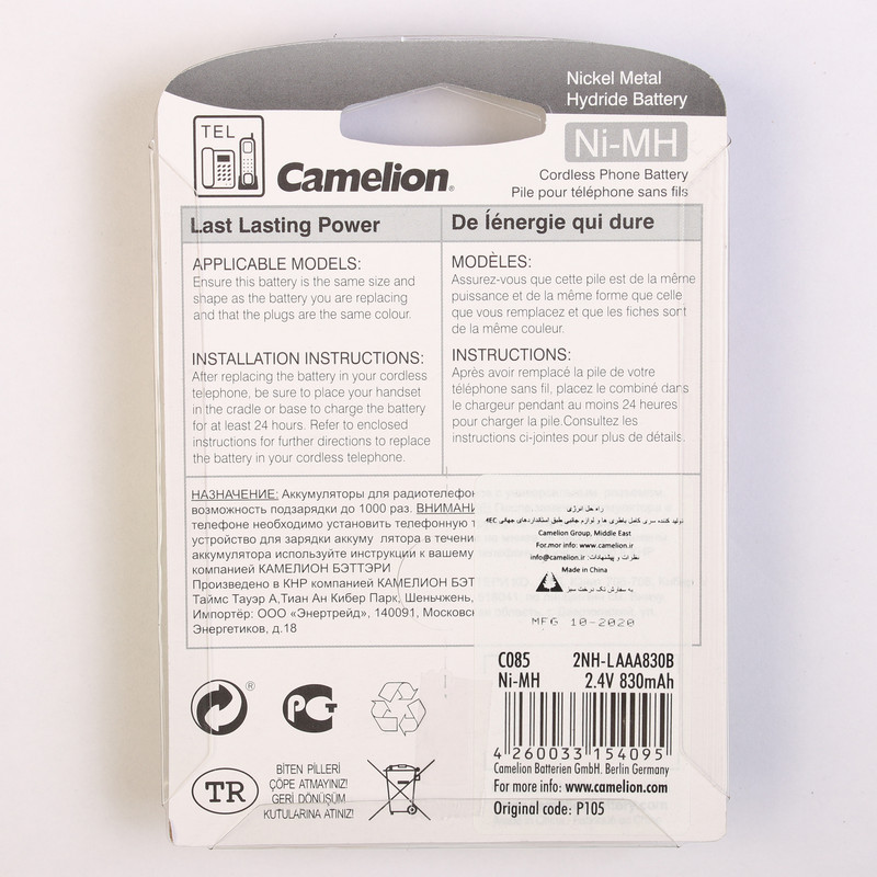 باتری تلفن «کملیون» مدل «P105» از نوع «Ni-MH» است و در ولتاژ 2.4 ولت عمل میکند. این باتری با ظرفیت 830 میلیآمپر برای استفاده در تلفنهای HHR-P105 مناسب است. این نوع باتریها دارای شکل خاصی هستند و برای استفاده در تلفنهای بیسیم طراحی و تولیدشدهاند. نکتهای که در خصوص این محصولات حائز اهمیت است، انتخاب آنهاست؛ بهطوریکه برای تهیه آنها باید دقت لازم را به عمل آورید؛ چراکه هر تلفن دارای باتری مخصوص به خود است و نمیتوان از یک نوع از باتریها برای تمامی تلفنها استفاده کرد. بنابراین پیش از تهیه این نوع از باتریها باید از طریق دفترچه راهنما یا عنوان حکشده بر روی دستگاه، از نوع باتری مناسب آن اطمینان حاصل کنید. شرکت کملیون تولیدکنندهای مشهور در صنعت باتریسازی است. این شرکت چینی محصولات خود را در تمامی نقاط جهان به فروش میرساند و از محبوبیت قابلتوجهی برخوردار است. از باتری C085 این شرکت میتوانید برای تلفنهای HHR-P105 استفاده کنید.