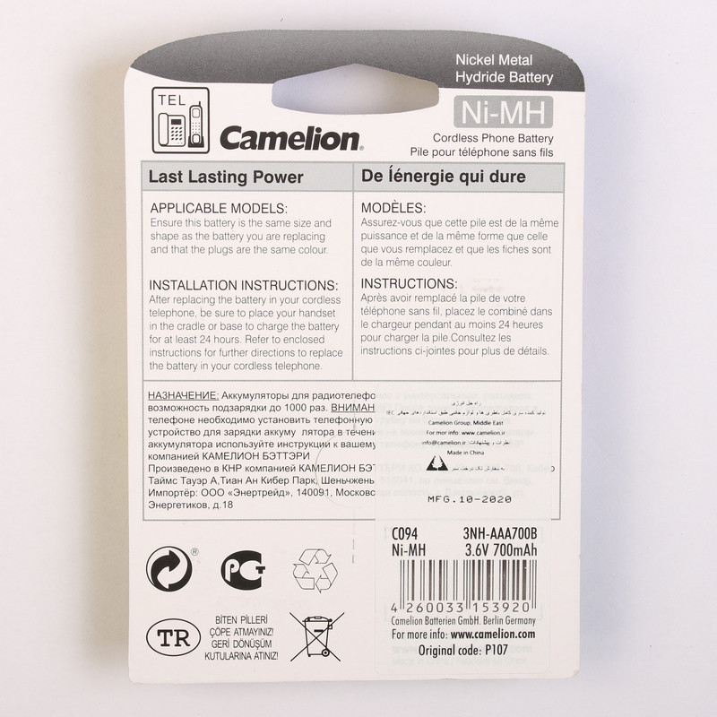 باطری تلفن بی ‌سیم کملیون مدل «P107» از نوع Ni-MH بوده و در ولتاژ 3.6 عمل می‌کنند .تکنولوژی ساختی که در تولید این نوع باتری به‌کاررفته ، نیکل متال هیدرید بوده و دارای پایداری انرژی الکتریکی و عمر مفید طولانی است. این مدل قابلیت شارژ مجدد دارد، پس طبیعتا می‌توان پس از اتمام انرژی الکتریکی دوباره آن را شارژ و استفاده کرد.