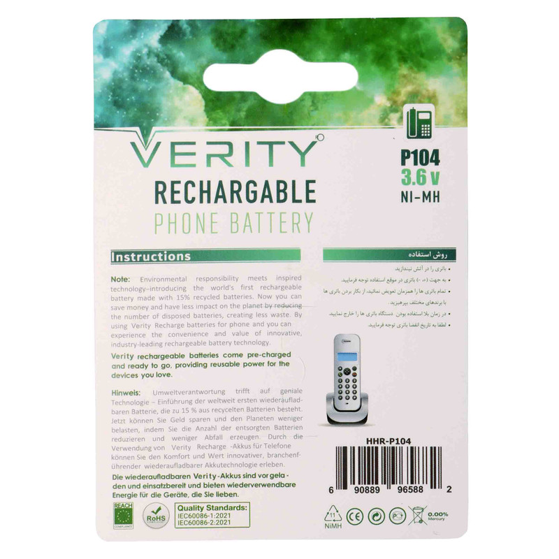 باتری تلفن بیسیم وریتی مدل P104 / P 104 با قابلیت 500 بار شارژ مجدد و دارای استاندارد های RoHS اروپا دارای ظرفیتی معادل 830 میلی مپر میباشد. این باتری های دارای تکنولوژی نیکل - متال هیدرید بوده و خیال شما برای تعویض باتری تا مدت ها راحت میکند.