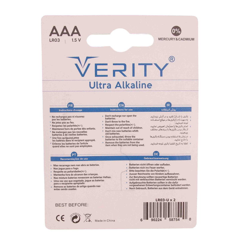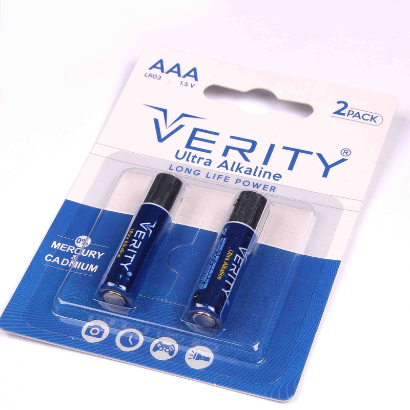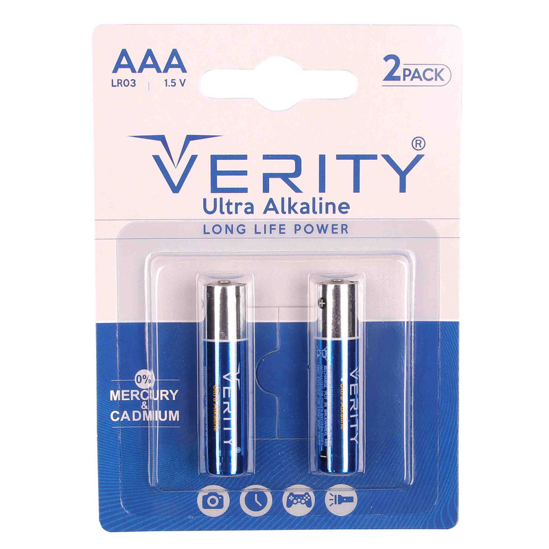 باتری های اولترا آلکالاین Verity ساخت چین تحت لیسانس انگلیس بوده و دارای پک هایی با پلمپ محکم و قوه های بدون نشت و سولفاته میباشد.