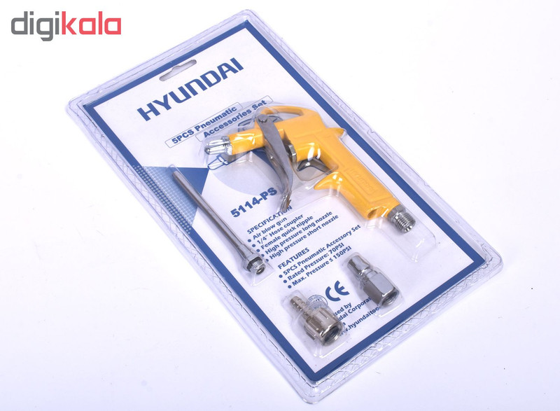 « بادپاش هيونداي مدل 5114PS » یکی از متداولترین و خوشدستترین بادپاشهای موجود در بازار است. ماشه این دستگاه فلزی است تا عمر بالای داشته باشد و با فشار دادن ماشه فلزی این بادپاش، میتوان مقدار خروجی باد فشرده را تنظیم نمود. انتهای این بادپاش دارای دنباله کوپلینگخور و هم دنباله شیلنگخور بوده تا کاربر بر اساس راحتی خود و یا با توجه به اتصالات موجود در دسترس از هر کدام از این دنبالهها استفاده نماید. به همراه این بادپاش، یک عدد نازل اضافی بلند نیز ارائه شده تا کاربر بر اساس نیاز از آن استفاده نماید.