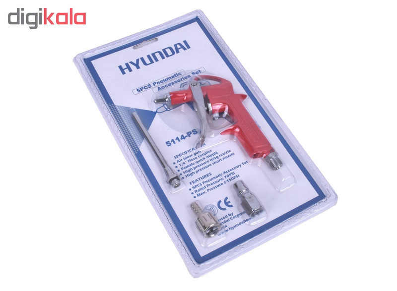 « بادپاش هيونداي مدل 5114PS » یکی از متداولترین و خوشدستترین بادپاشهای موجود در بازار است. ماشه این دستگاه فلزی است تا عمر بالای داشته باشد و با فشار دادن ماشه فلزی این بادپاش، میتوان مقدار خروجی باد فشرده را تنظیم نمود. انتهای این بادپاش دارای دنباله کوپلینگخور و هم دنباله شیلنگخور بوده تا کاربر بر اساس راحتی خود و یا با توجه به اتصالات موجود در دسترس از هر کدام از این دنبالهها استفاده نماید. به همراه این بادپاش، یک عدد نازل اضافی بلند نیز ارائه شده تا کاربر بر اساس نیاز از آن استفاده نماید.