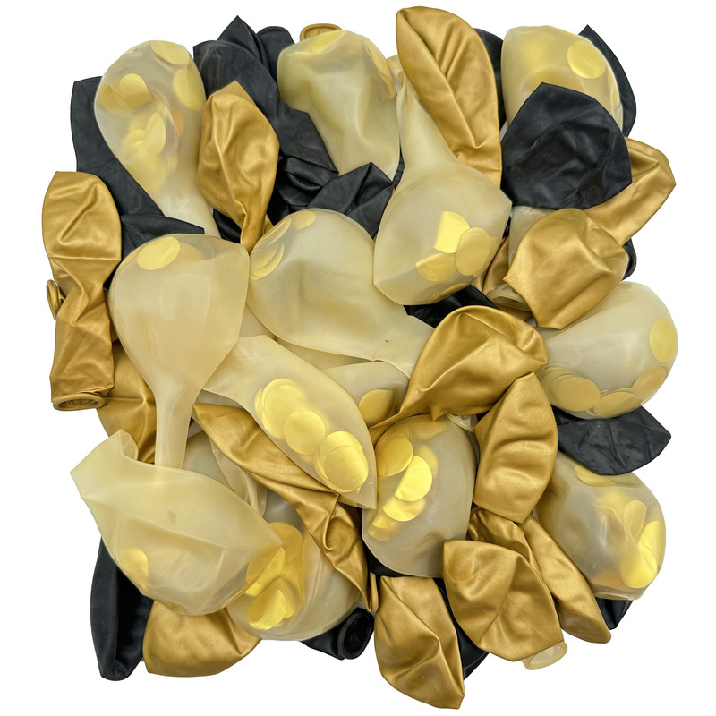 مجموعه بادکنک 50 عددی شامل بادکنک های مشکی - طلایی - شیری دارای پولک طلایی ، ساخت کشور چین می باشد. این مجموعه بادکنک قابلیت باد شدن با باد معمولی و هلیوم می باشد.