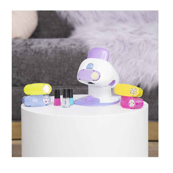 قابلیت منحصر به فرد این مجموعه وجود 5 طرح مختلف استمپ است که کودکان میتوانند به راحتی طرح های موجود را بر روی ناخن‌های لاک‌زده‌ی دست‌ها و پاها چاپ کنند ، فقط کافیست که انگشتان لاک زده‌ی خود را به نوبت داخل دستگاه قرار دهید و دکمه‌ی بالایی رو فشار دهید . برای استفاده از این دستگاه باید از لاک‌های مخصوصی که در بسته وجود دارد استفاده کرد ابتدا یکی از دو رنگ لاک را انتخاب کنید، بعد از چند لحظه تکان دادن ، یک لایه‌ی نازک از لاک را روی ناخن‌های خود بزنید. ویژگی جدید این استمپر این است که می‌توانید با طرف دیگر این دستگاه لاک‌های انگشتانتان را هم خشک کنید، با روشن کردن فَن بعد از گذشت 5 دقیقه لاک‌ها خشک میشوند . اکنون میتوانید هر طرحی را که دوست دارید روی ناخن هایتان چاپ کنید ، به این صورت که یکی از 5 طرح را داخل دستگاه قرار دهید و اهرم بالایی رو محکم به مدت 2 ثانیه روی هر ناخن فشار بدهید و در انتها تاپ کُت را روی طرح‌های ناخن بزنید تا دوام بیشتری داشته باشند در ضمن دستگاه فوق نیاز به 4 عدد باطری نیم قلمی دارد .