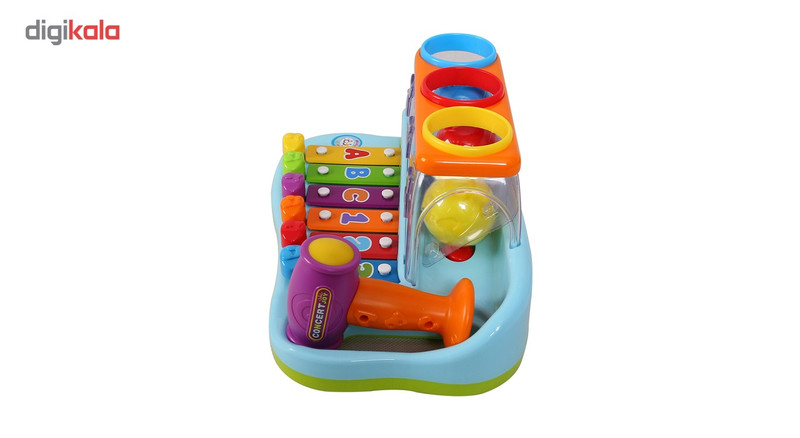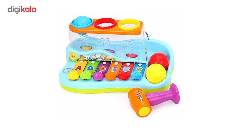 اقلام همراه | دارای ۶ کلید نت موزیکال دارای یک چکش برای ضربه زدن به نت ها دارای ۳ توپ زرد ، آبی و قرمز |