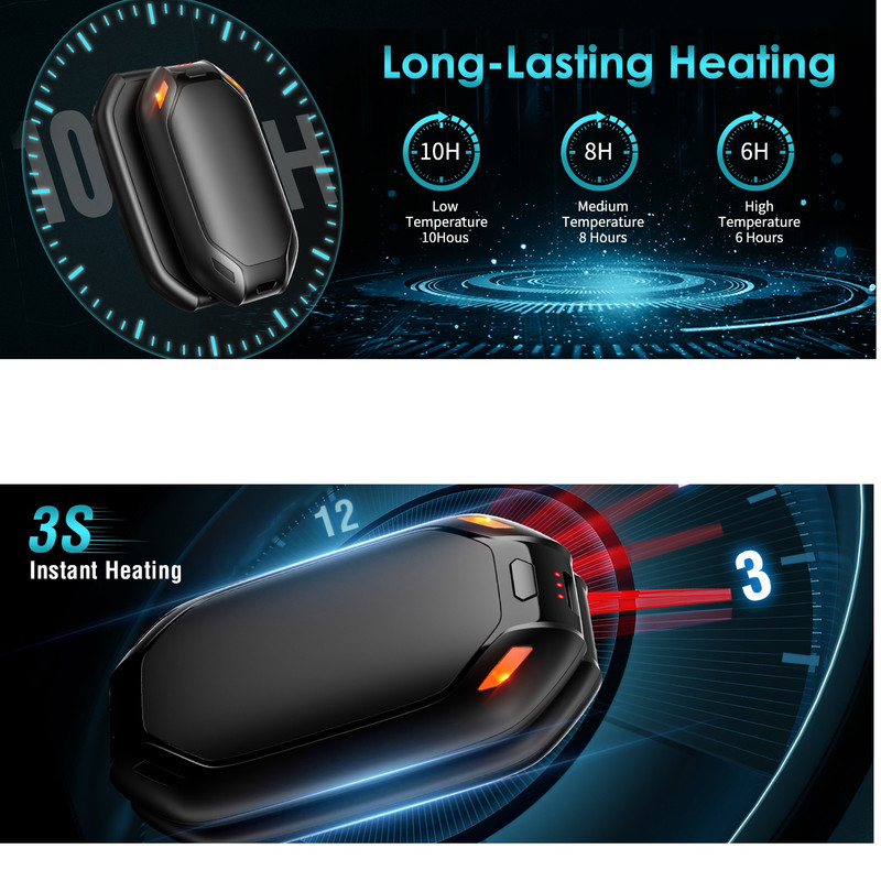 ماندگاری بالا : این گرمکن دست مجهز به باتری قابل شارژ داخلی 3000 میلی‌آمپر ساعتی است که می‌تواند 6 تا 10 ساعت کار کند. می‌توانید هر دو گرمکن دست را به طور همزمان با کابل 2 در 1 نوع C شارژ کنید. شارژ کامل تنها 5 ساعت طول می‌کشد. طراحی دو در یک گرمکن دست به شما این امکان را می‌دهد که از آن برای هر دو دست خود استفاده کنید یا گرمای آن را با معشوق یا دوستانتان به اشتراک بگذارید.
