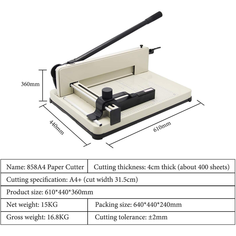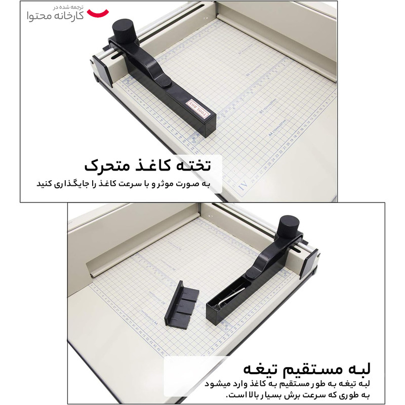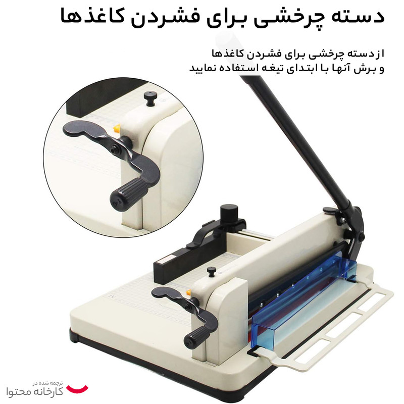 | سایر توضیحات | تیغه آلمانی سایز برش a3 تعداد برگ برش:400 برگ دارای دسته اهرمی نگهدارنده کاغذ فلکه ای مناسب دفتر فنی و انتشارات |