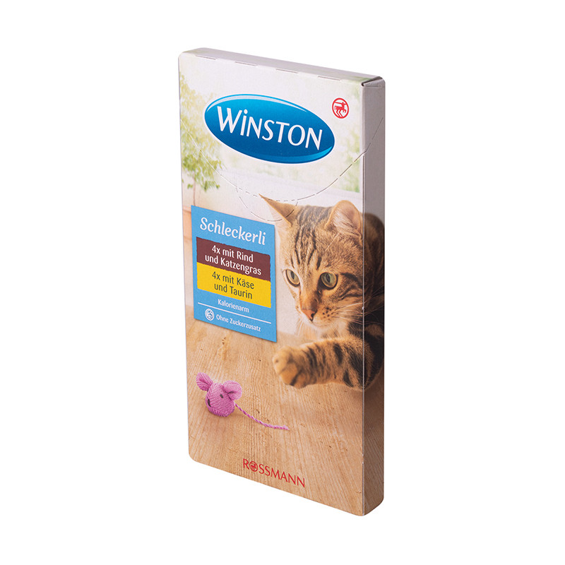 بستنی گربه وینستون یک میان وعده کم کالری، متنوع و خوشمزه برای گربه شما است که از مواد غذایی خوشمزه مانند پنیر ساخته شده و بسیار مناسب گربه های بد اشتها می‌باشد. این محصول را می‌توان بصورت منحصرا و یا به همراه غذای خشک ( مثل سُس ) به گربه هایی که بد اشتها هستند یا بعنوان تشویقی داد. حالت ژلاتینی بودن این محصول حس چشایی گربه را تحریک می‌کند و همین امر موجب می‌شود تا گربه‌ی شما به خوردن غذا ترغیب شود...