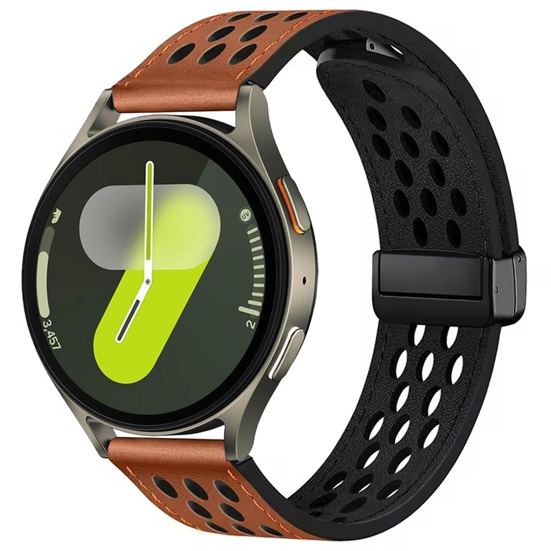 بند این ساعت هوشمند از ترکیبی از چرم مصنوعی و سیلیکون طراحی شده که هم ظاهری شیک و حرفهای دارد و هم دوام و راحتی بالایی را ارائه میکند. استفاده از قفل مگنتی نه تنها باز و بسته کردن بند را بسیار آسان میکند، بلکه ثبات و امنیت بیشتری به ساعت میبخشد. این ترکیب متریال و طراحی کاربردی، باعث میشود این بند هم برای استفاده روزمره و هم برای فعالیتهای ورزشی مناسب باشد.