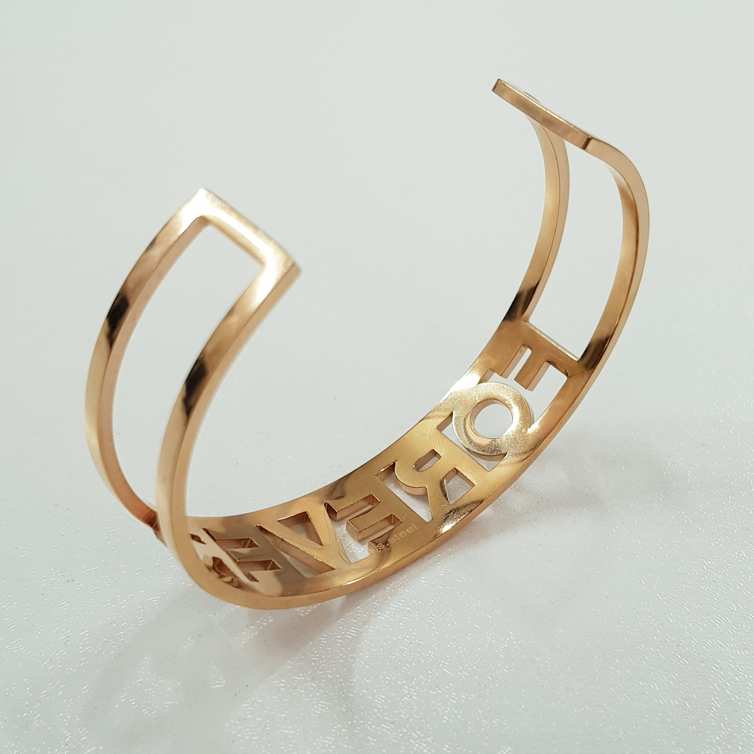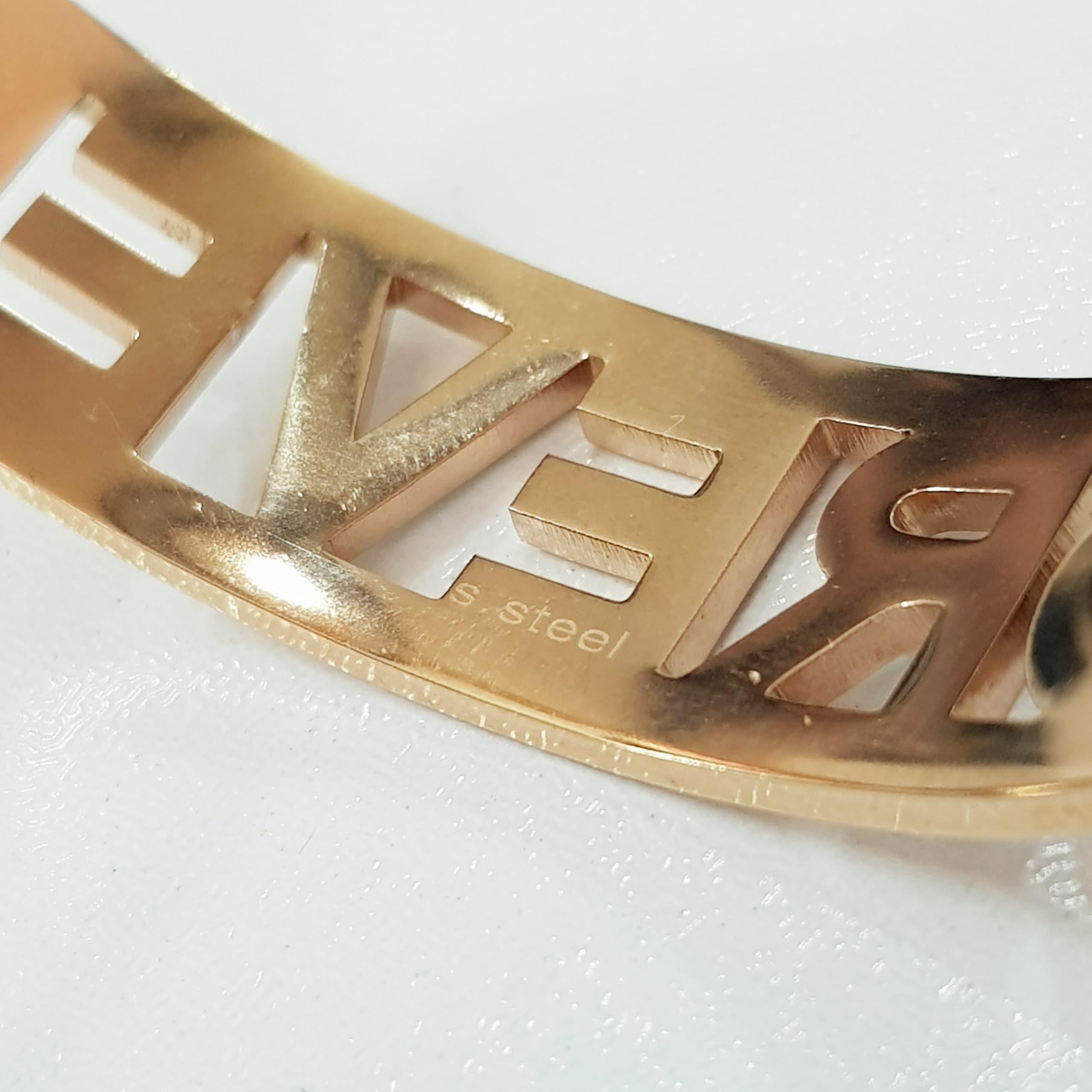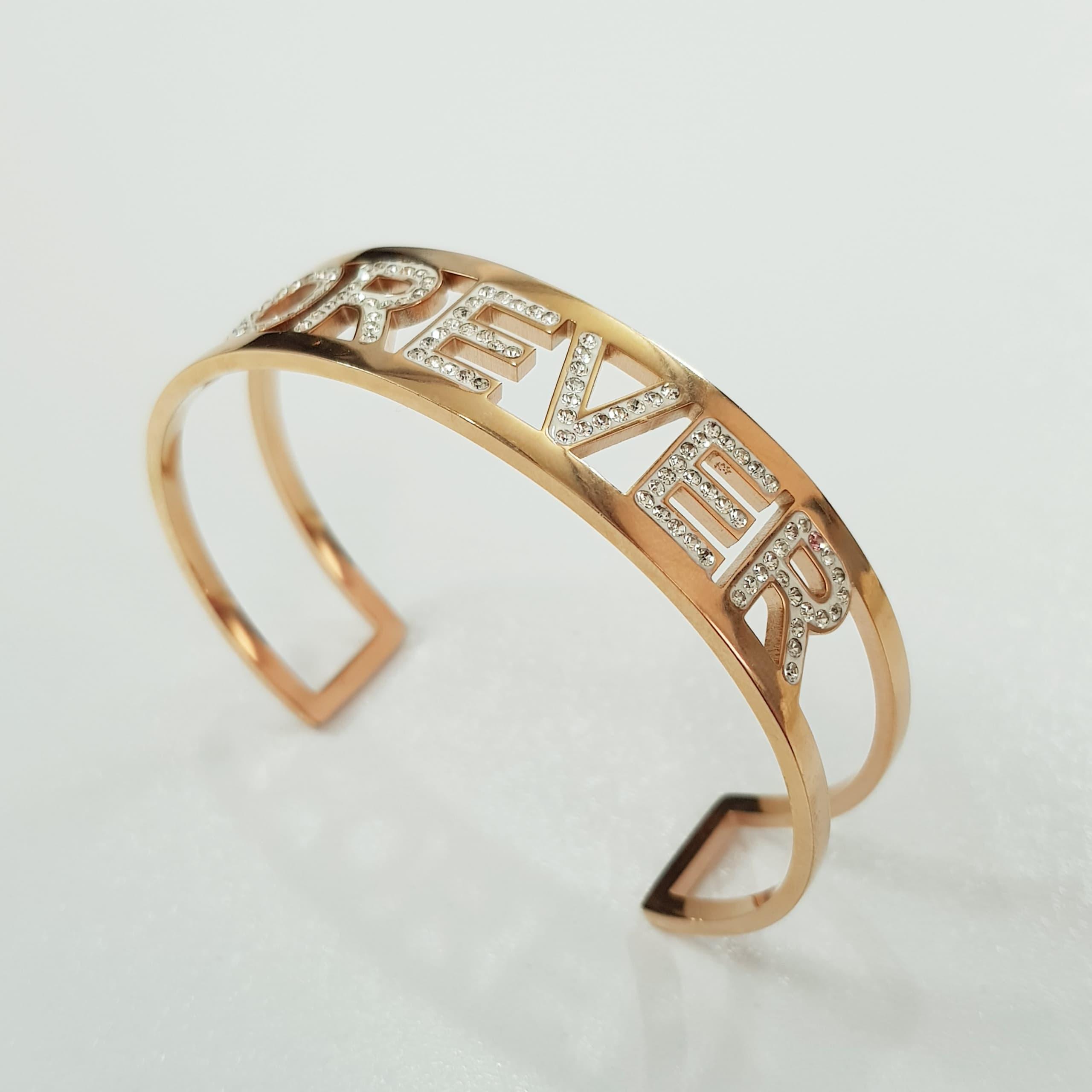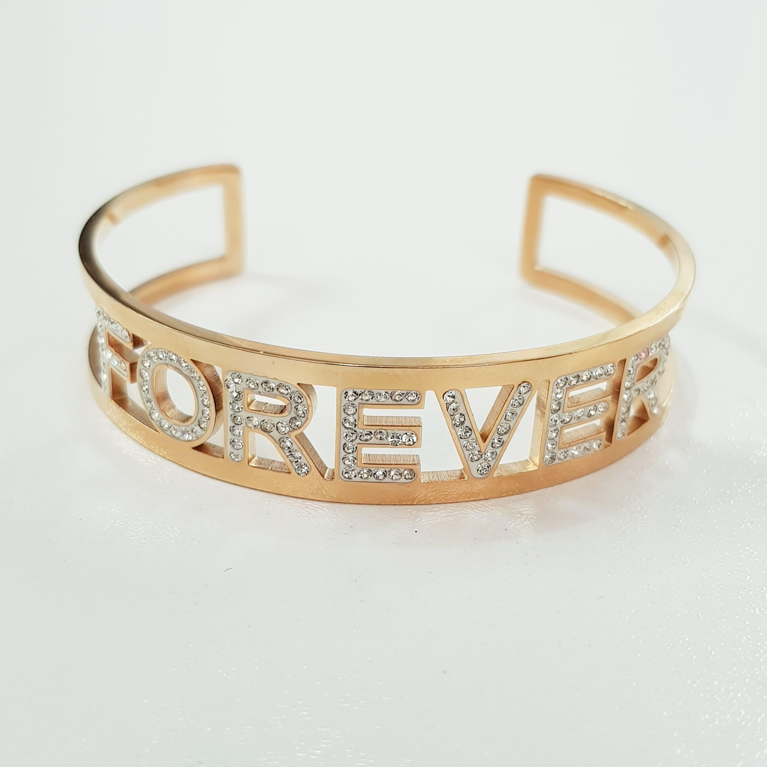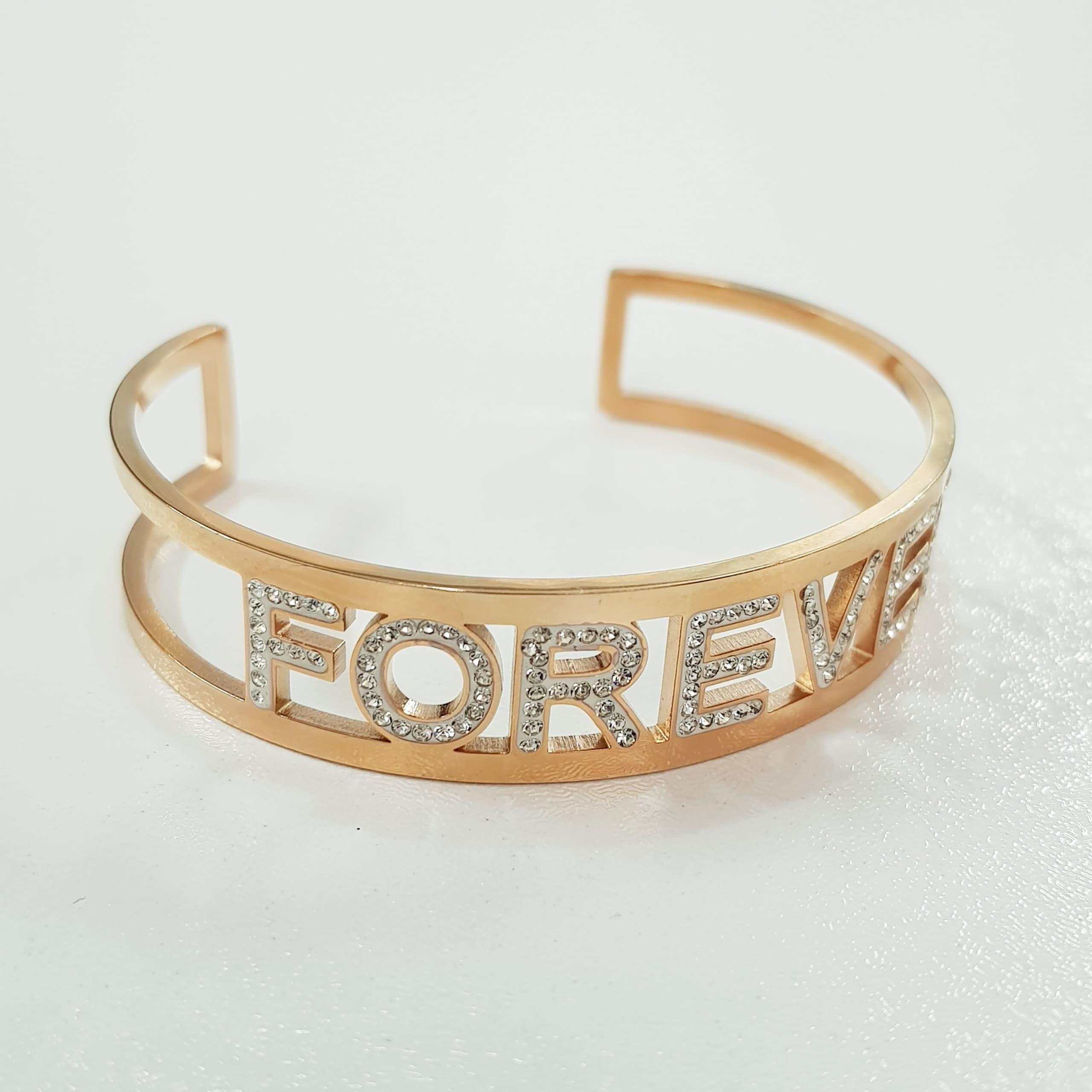 بنگل استیل طلایی طرح Forever فول نگین ، مهر استیل حک شده داخل بنگل ، کار ترند بسیار زیبا و جذاب برند forever ضد حساسیت