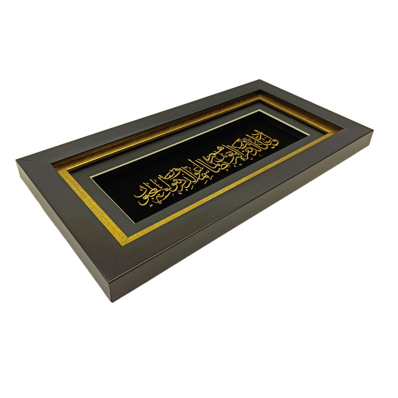 حروف و نقشها با روکش طلا کار شدهاند و در تضاد چشمنواز با پسزمینهی مشکی مخملی، درخششی خاص و جلوهای سهبعدی به خود گرفتهاند. ظرافت در طراحی خطوط عربی و توازن در ترکیببندی، این تابلو را به اثری همزمان معنوی و هنرمندانه بدل کرده است.
